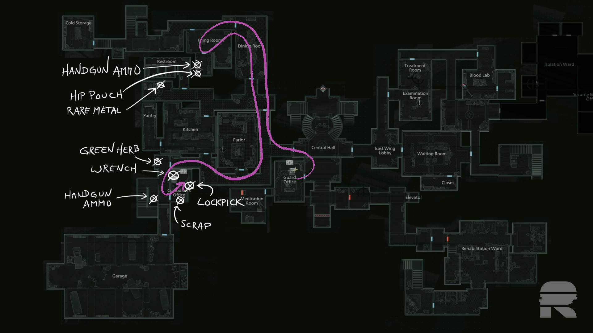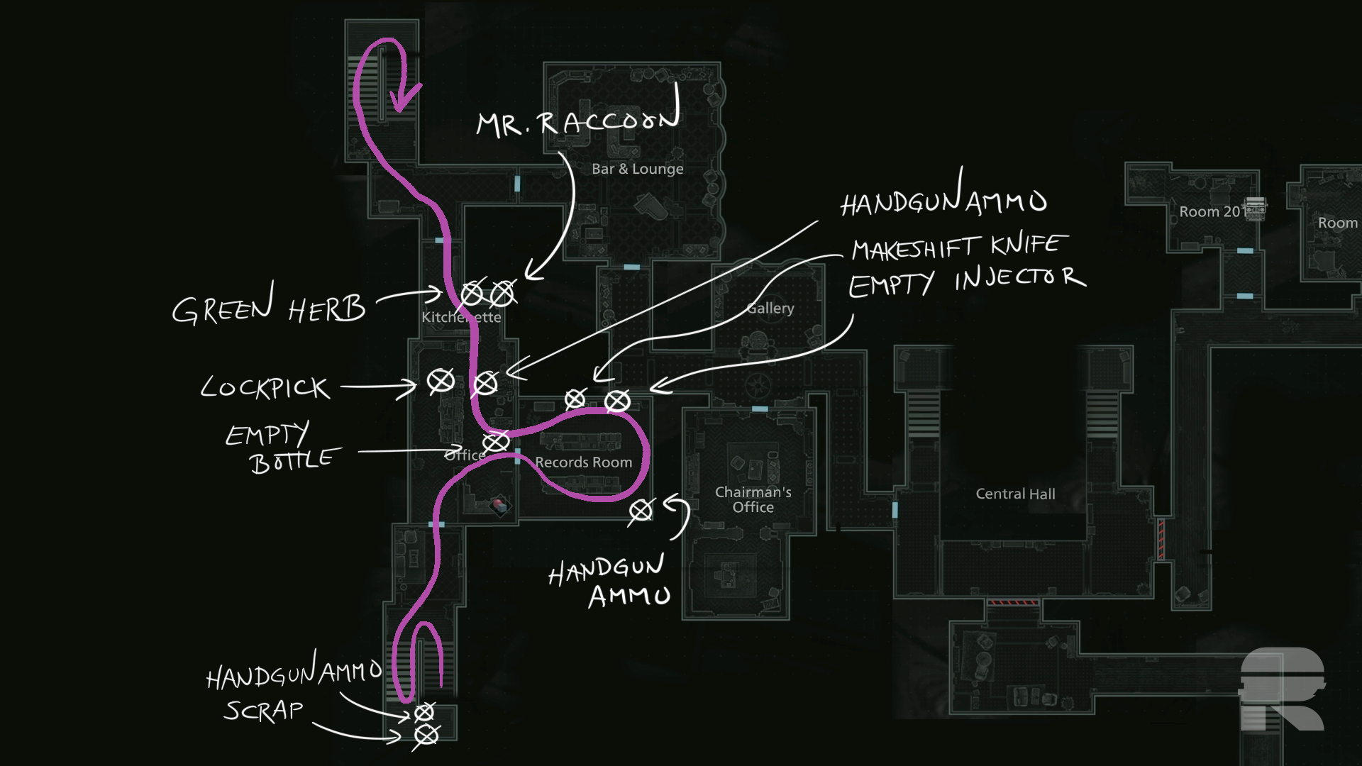 In der hinteren rechten Ecke befindet sich eine Kiste mit Pistolenmunition. Lesen Sie in der Mitte den Bericht des Entsorgungsteams. Nehmen Sie an der Nordwand den leeren Injektor und öffnen Sie das Schließfach für ein provisorisches Messer. Man hört einen Mr. Raccoon,…