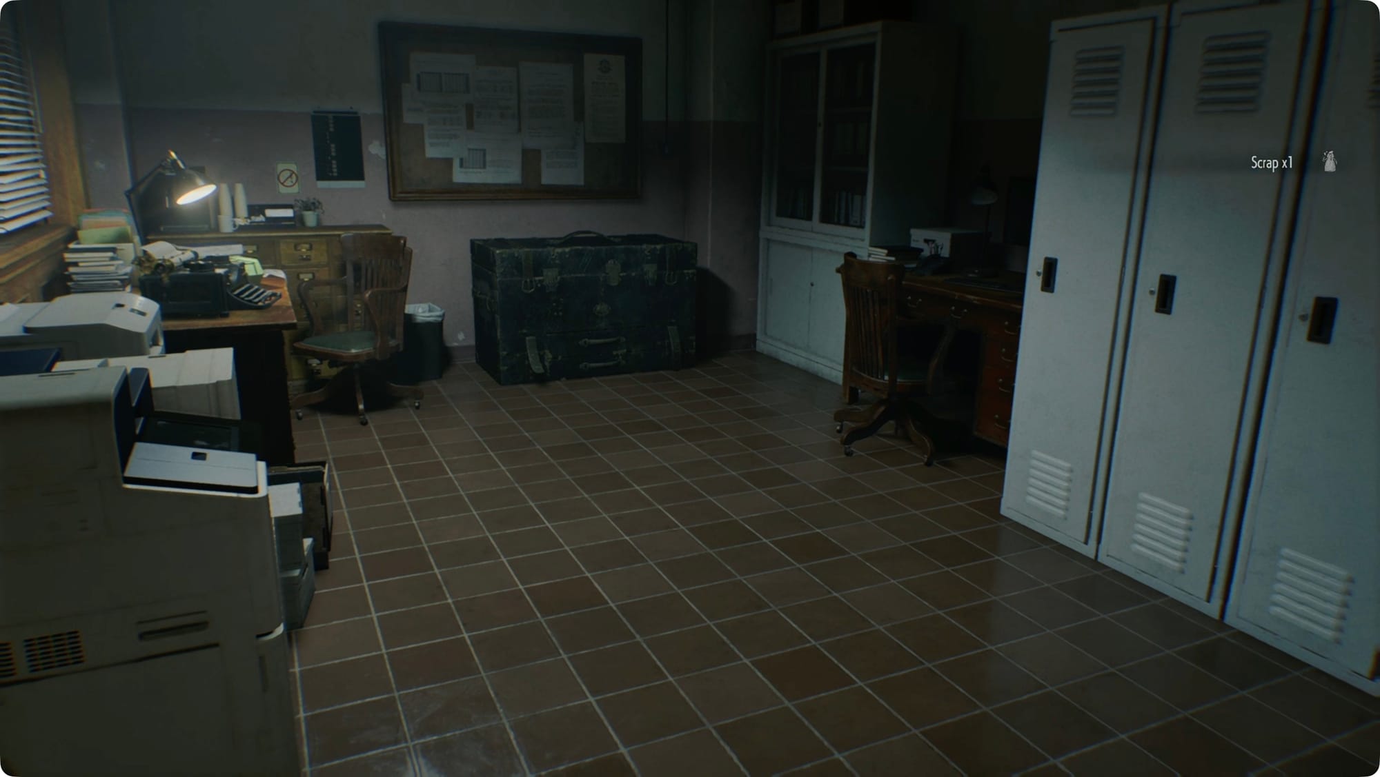 Schnappen Sie sich das grüne Kraut und biegen Sie links ab. Ignorieren Sie das Treppenhaus zu Ihrer Rechten, halten Sie an der rechten Wand Ausschau nach der Baumitteilung und gehen Sie durch die erste Tür auf der linken Seite, um das Büro der Depotbank zu betreten. Schnappen Sie sich den Schrott und öffnen Sie das zweite Schließfach für einen weiteren Dietrich.