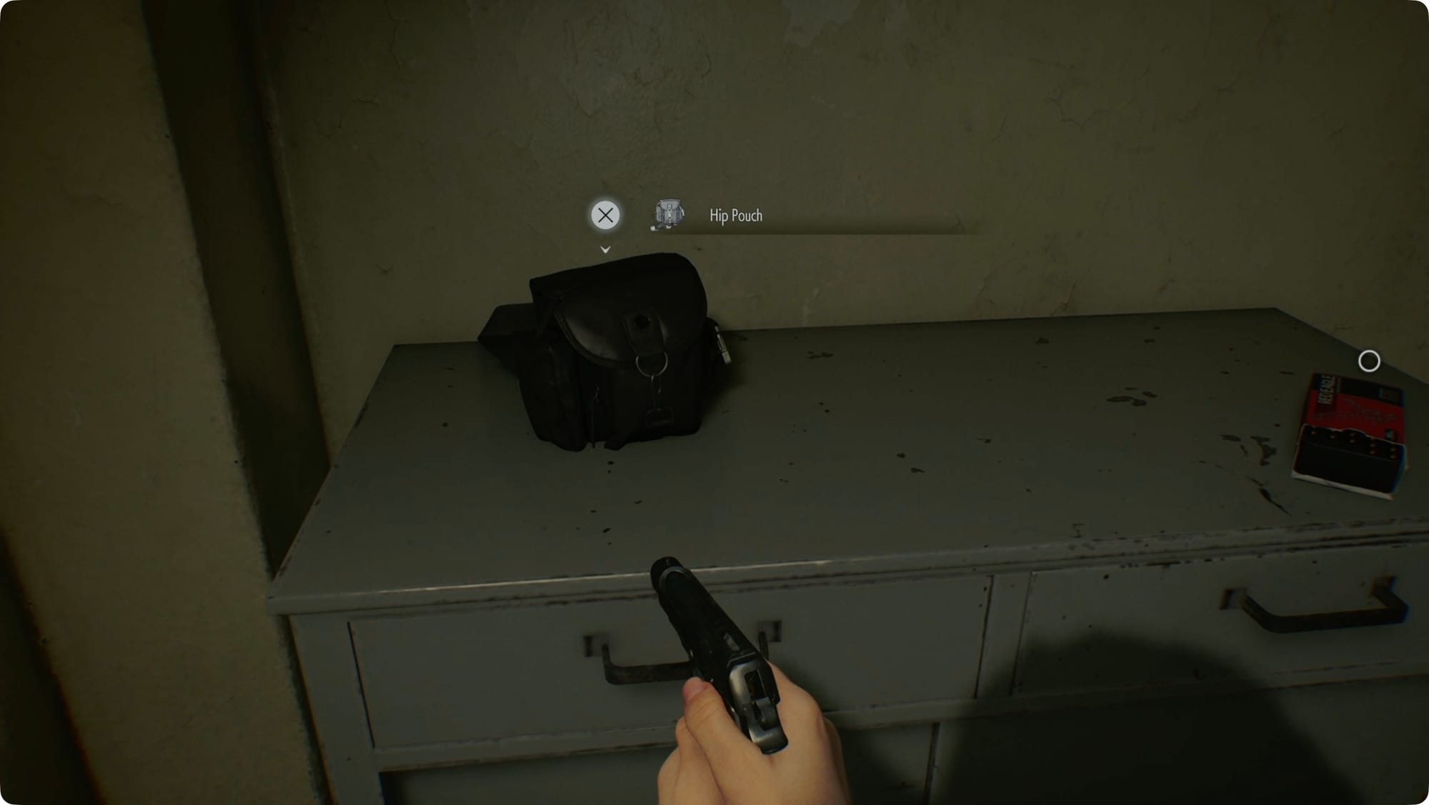 Wenn Sie dort ankommen, verwenden Sie das ID-Armband an der Tür, um Zugang zum Hinterzimmer zu erhalten. Es gibt einen Kleiderschrank, den wir noch nicht öffnen können, aber das macht nichts, denn es gibt noch eine weitere Hüfttasche zum Mitnehmen. Sammle auch die Pistolenmunition ein.