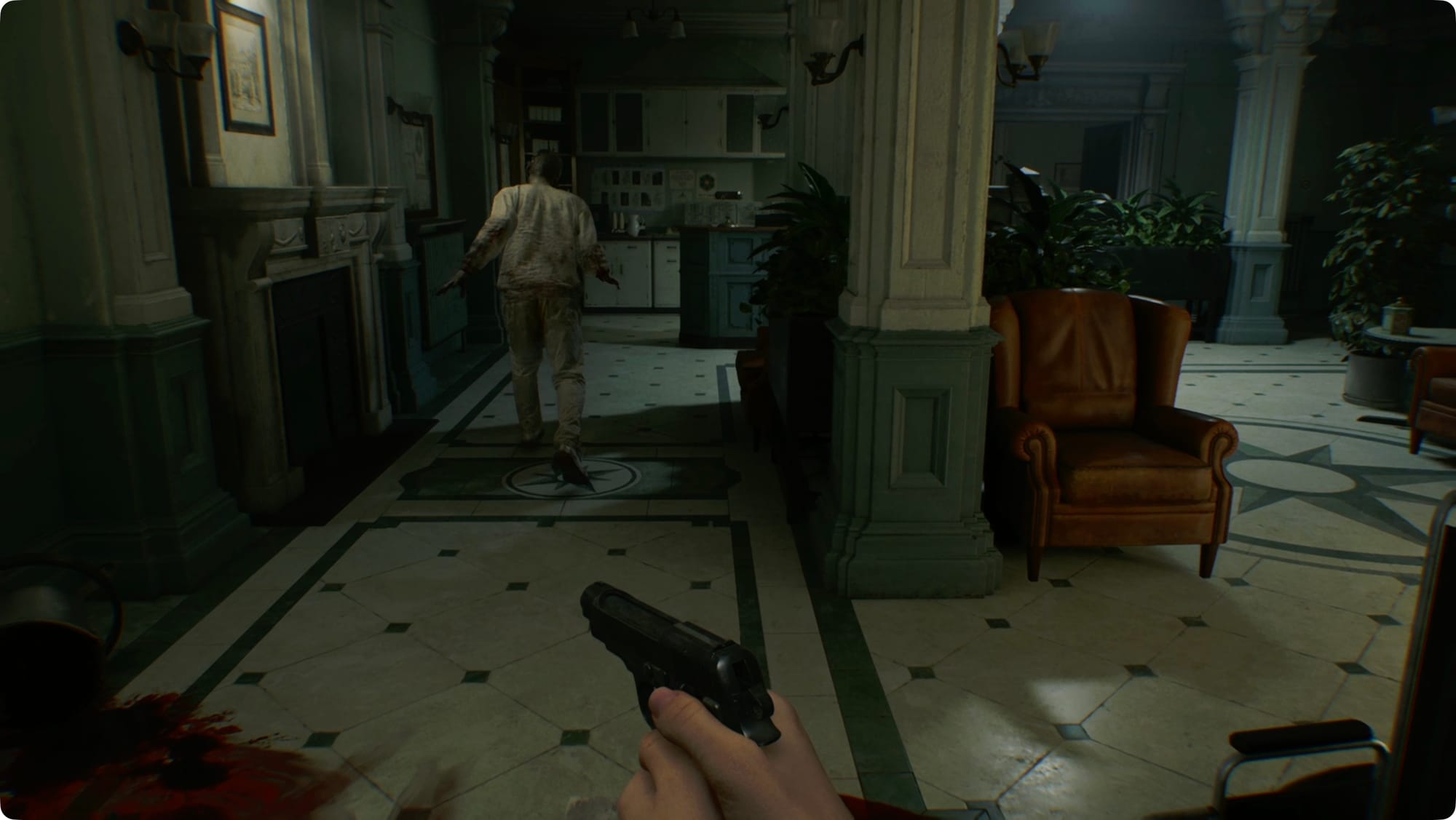Gehen Sie durch das Dogleg und schnappen Sie sich noch mehr Pistolenmunition. Durchbrechen Sie die Tür zur Lounge.