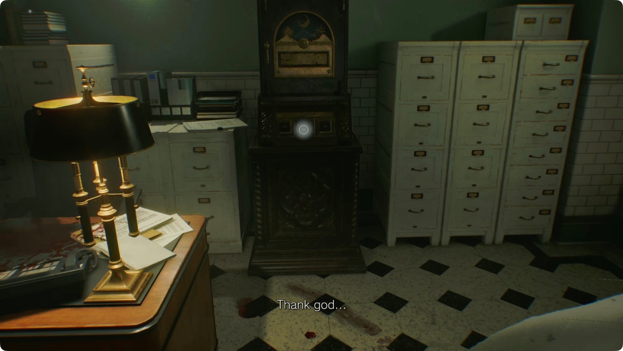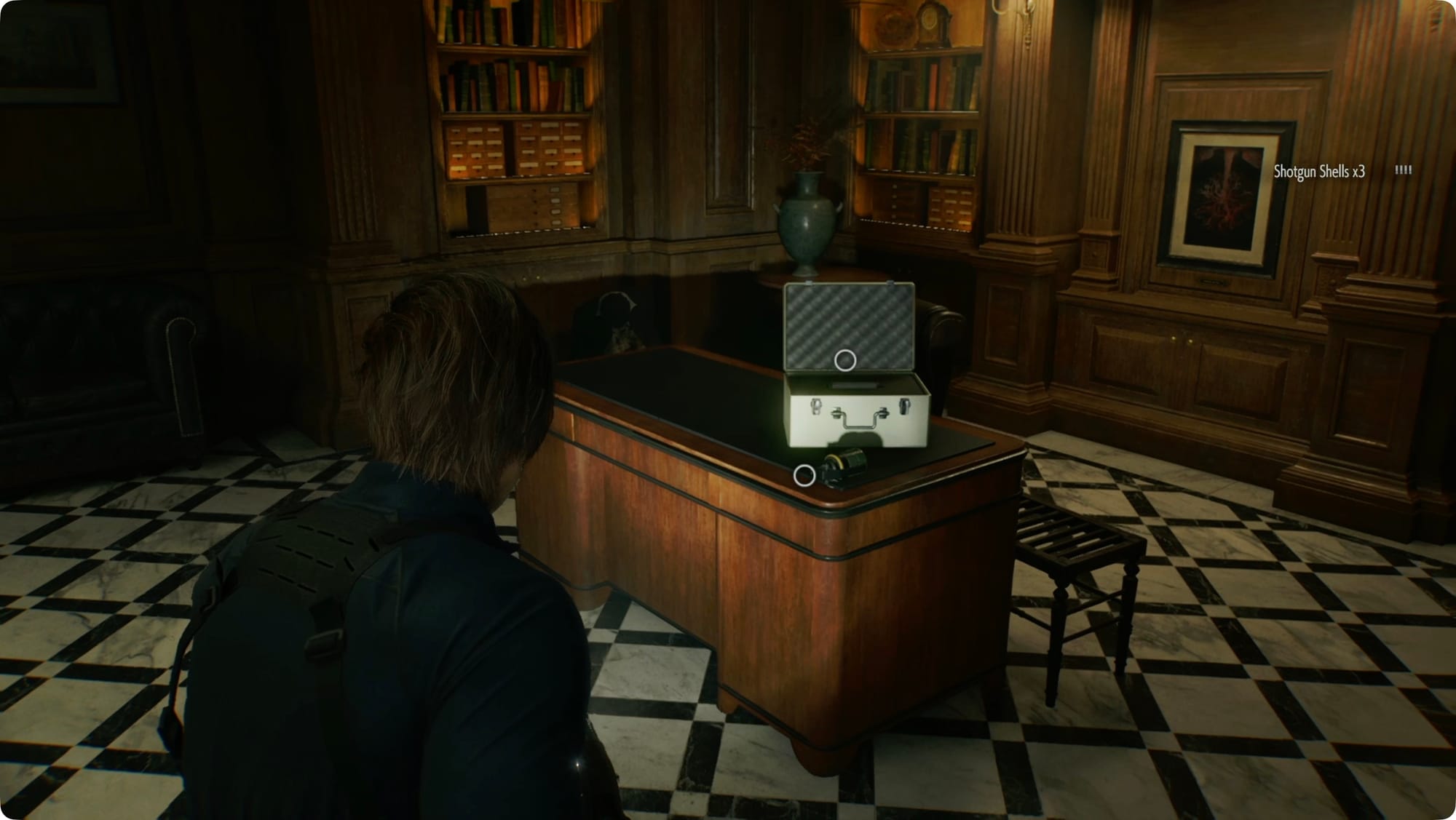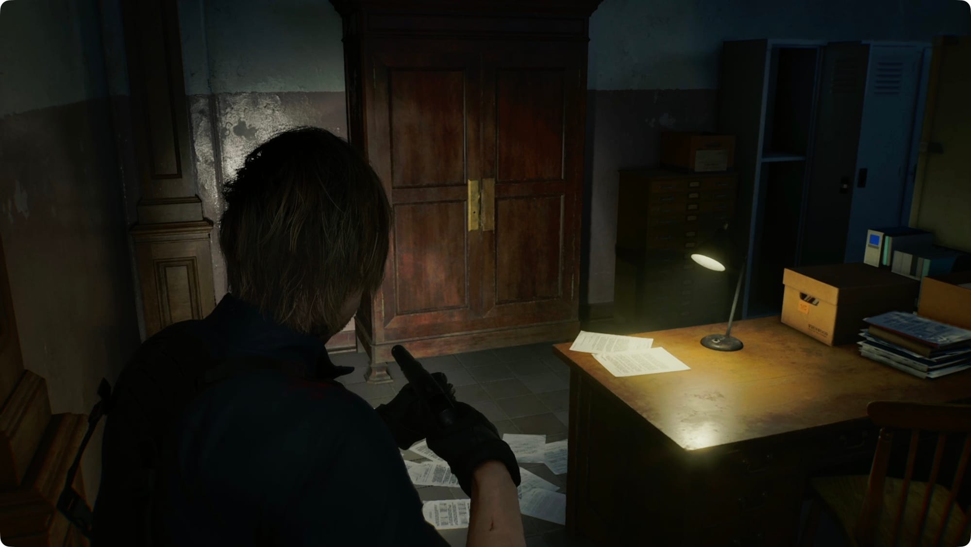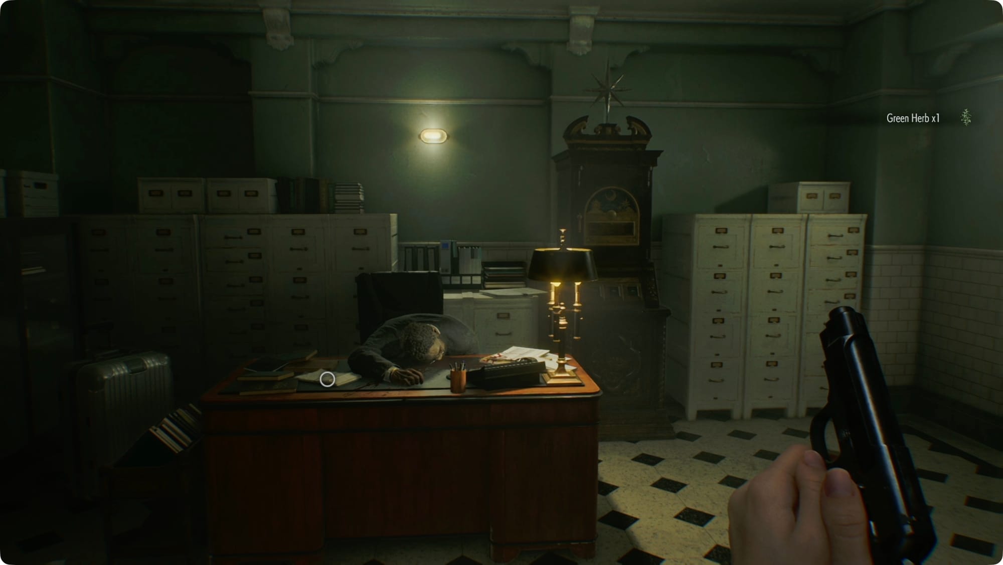 Nehmen Sie nach der Bar die erste Straße links, um zurück ins Büro zu gelangen. Öffne den Kleiderschrank im Archivraum, um einen Mr. Raccoon, etwas Pistolenmunition und ein gemischtes Kraut (G+G) zu erhalten.
