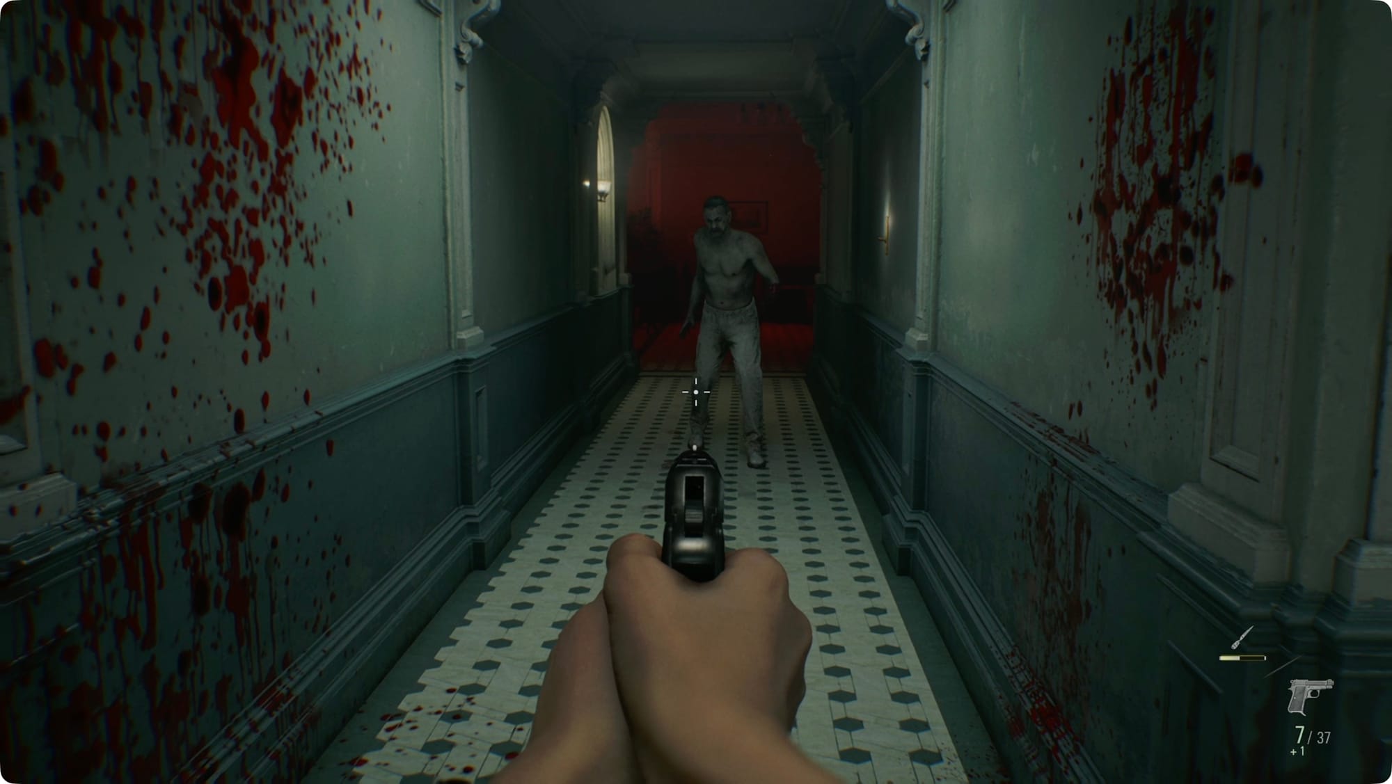 Die Lounge ist ein Blutbad und ein Blisterhead wird zu Ihrer Linken auftauchen. Die Schrotflinte erleichtert den Kampf. Zwei oder drei Kopfschüsse, gefolgt von einem Nahkampf, lassen die Blase platzen.
