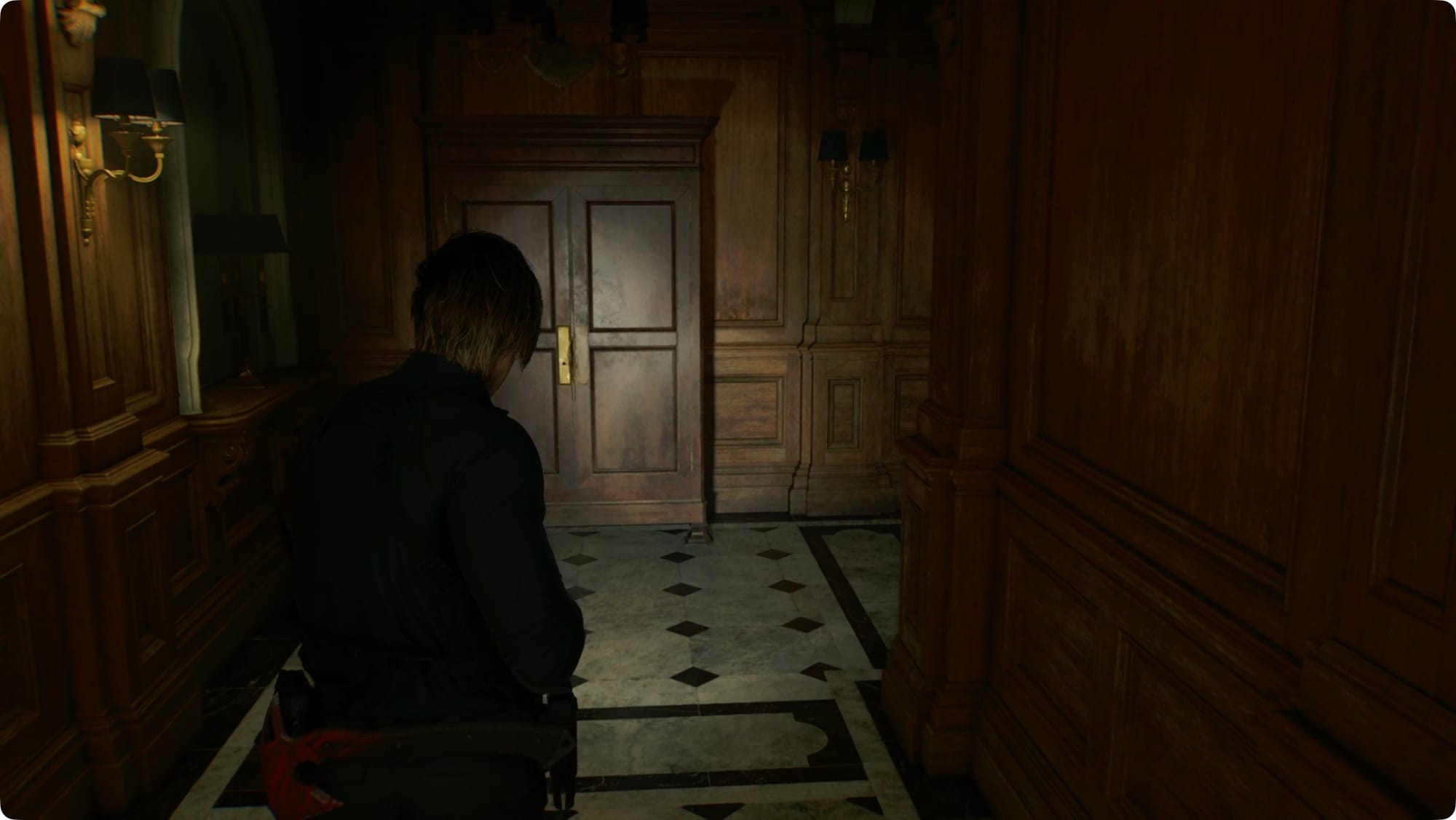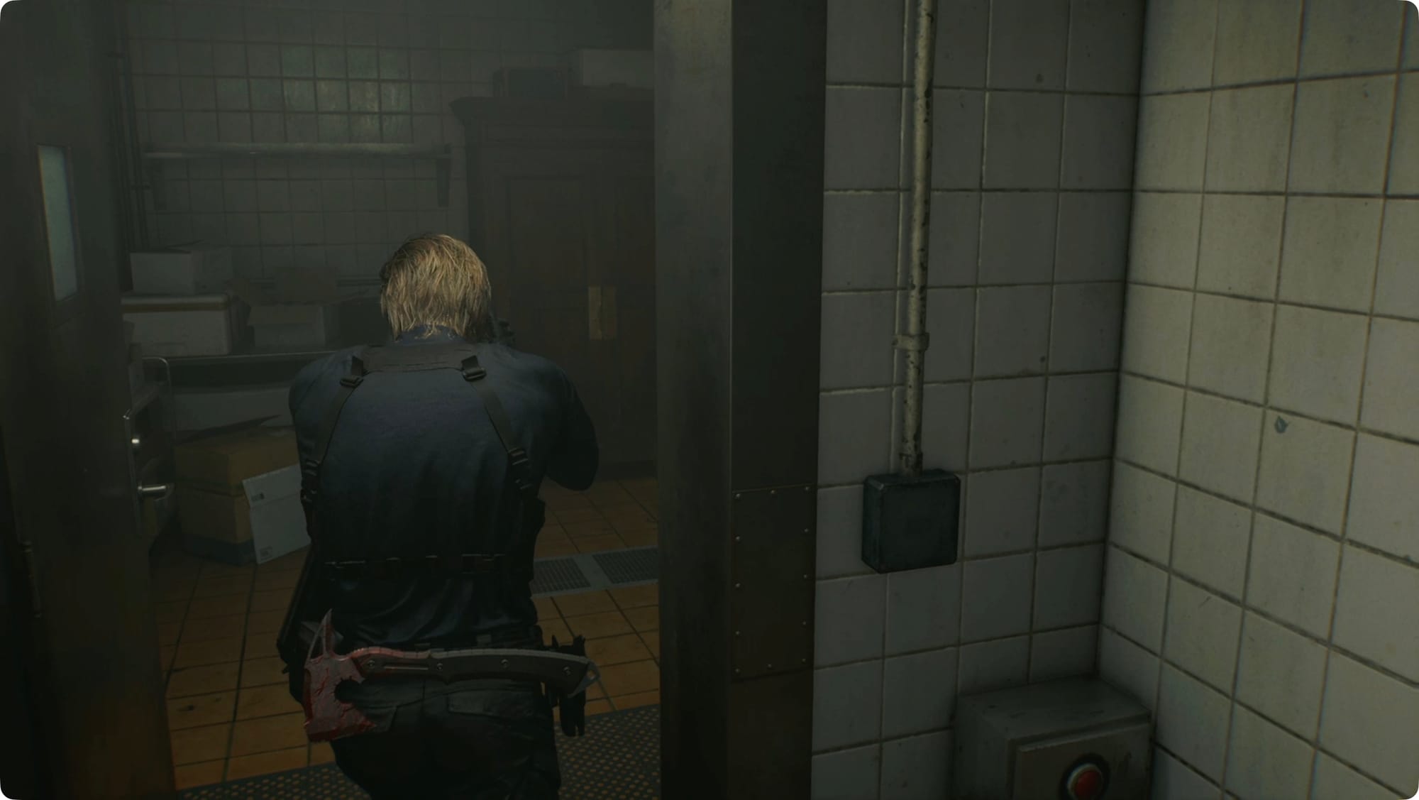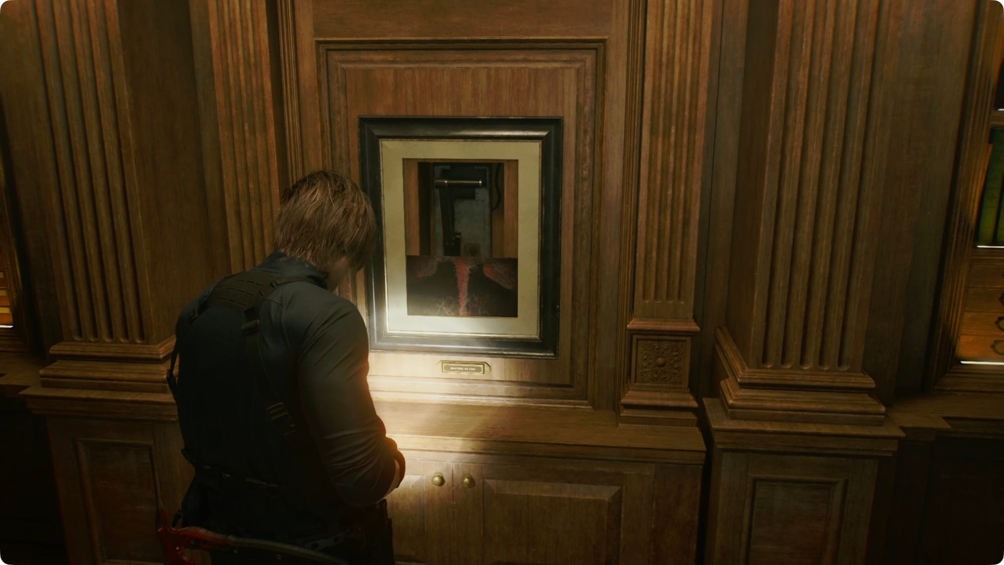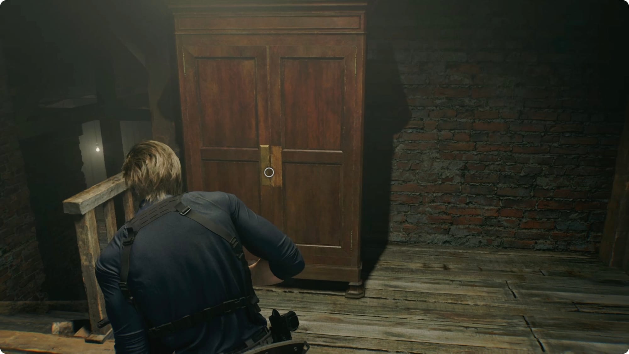 Du kommst zu einem dieser verzogenen Kleiderschränke, aber Leon kann sie mit seiner Axt öffnen! Darin befinden sich eine Basement Safe Code-Datei und ein Kompensator. Öffnen Sie Ihr Inventar, um es an Ihrer Alligator Snapper(?)-Pistole anzubringen.