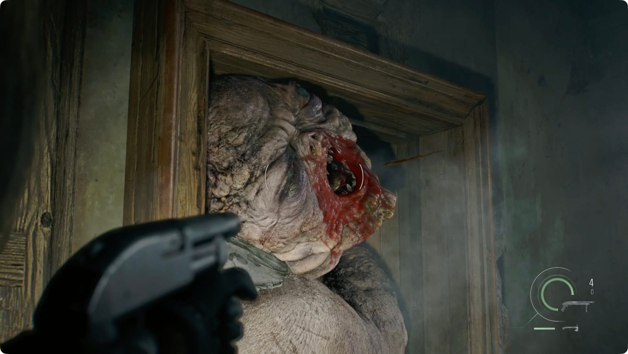 Gehen Sie nach rechts zurück und Sie gelangen durch eine Tür, die er nicht betreten kann (wo Sie die Pistolenmunition aufgehoben haben). Während er feststeckt, schießen Sie ihm drei Schrotflinten ins Gesicht und führen anschließend einen Axtangriff durch, wenn er betäubt ist.