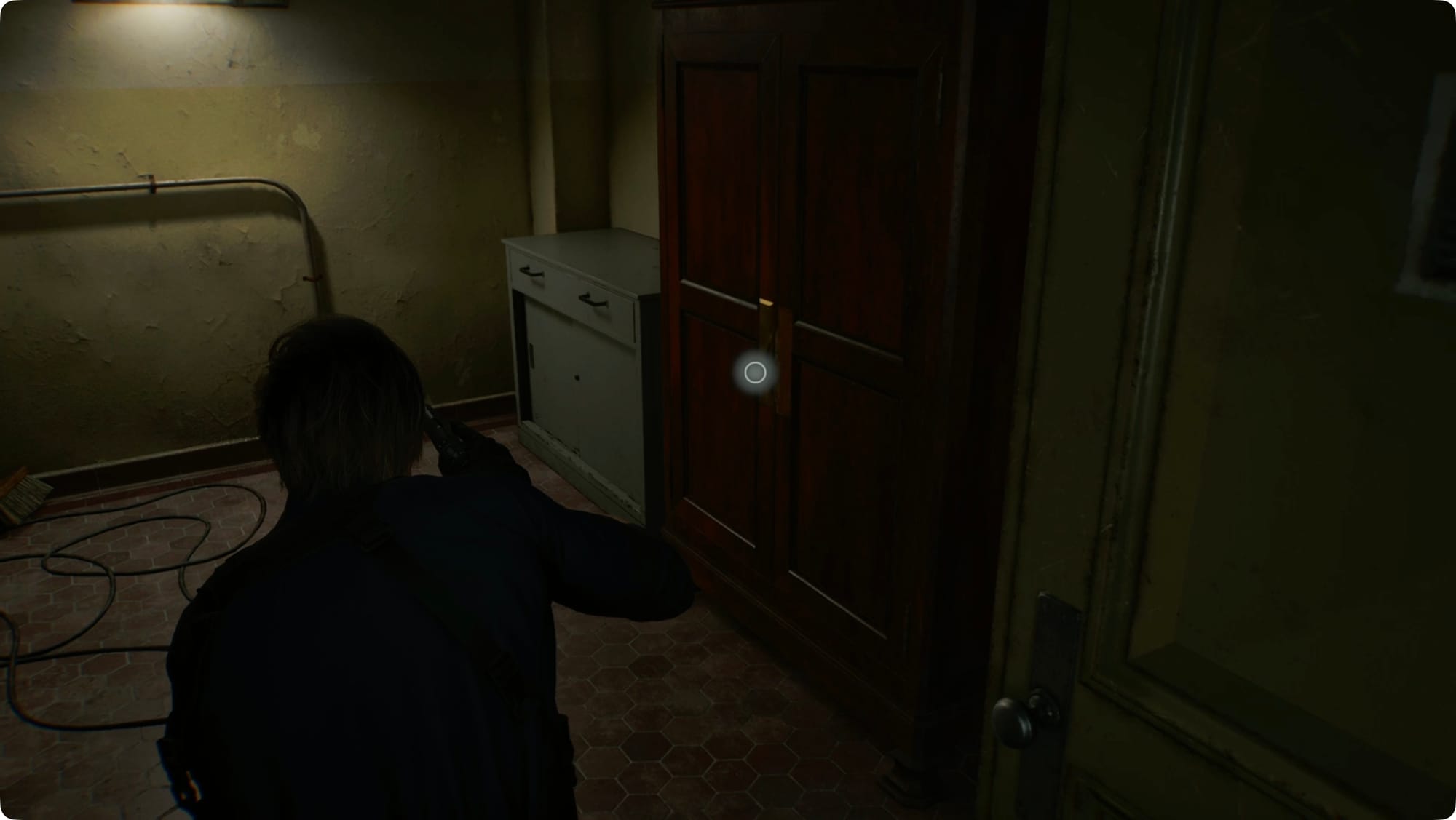 Der nächste Kleiderschrank befindet sich im Raum neben dem Aktenraum. Darin befinden sich ein Med Injector und etwas Handfeuerwaffenmunition.
