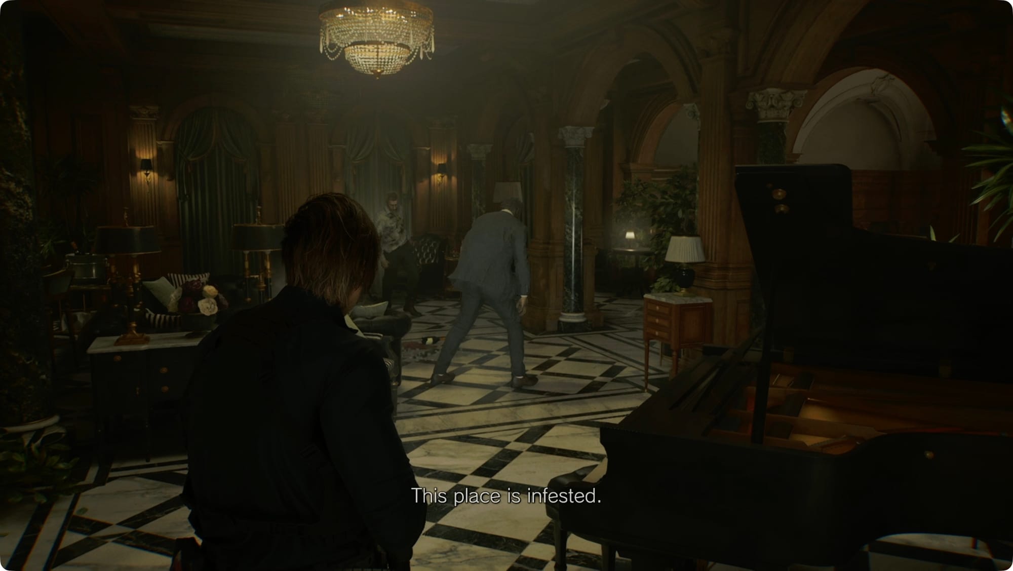 Biegen Sie rechts ab und kümmern Sie sich um das Zombie-Trio in der Bar & Lounge. Der Sänger lässt eine antike Münze fallen, aber Leon kann sie nicht aufheben. Auf der anderen Seite befindet sich ein grünes Kraut.