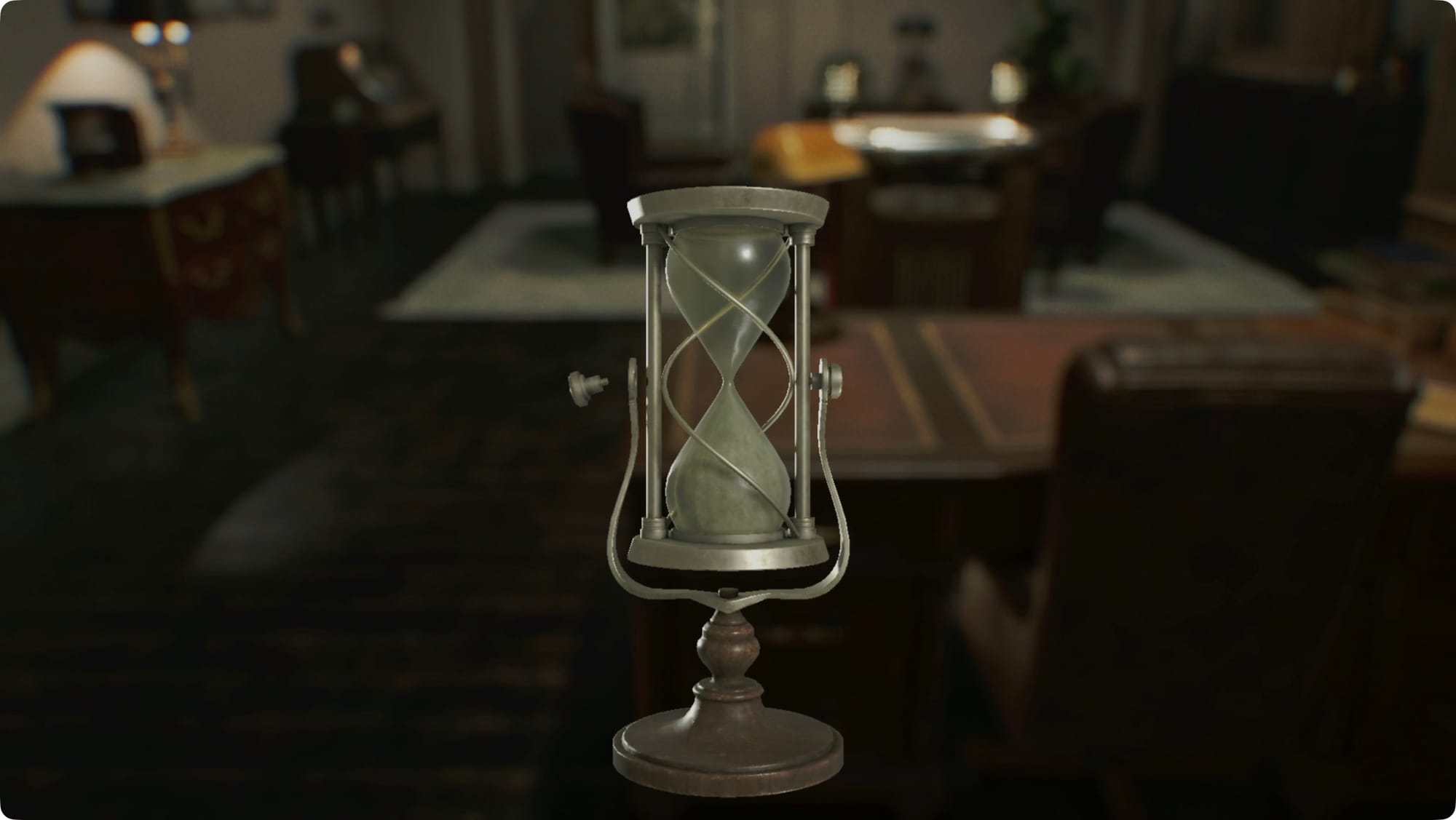 Hier gibt es viel zu sehen. Lesen Sie auf dem Schreibtisch den Hinweis zur Forschungsergebnisdatei. Hebe die Sanduhr auf. Während Sie es untersuchen, drehen Sie es so, dass die Drehschrauben zu Ihnen zeigen, und entfernen Sie sie dann. Sobald Sie dies getan haben, holen Sie sich den Gegenstand „Sanduhr“.