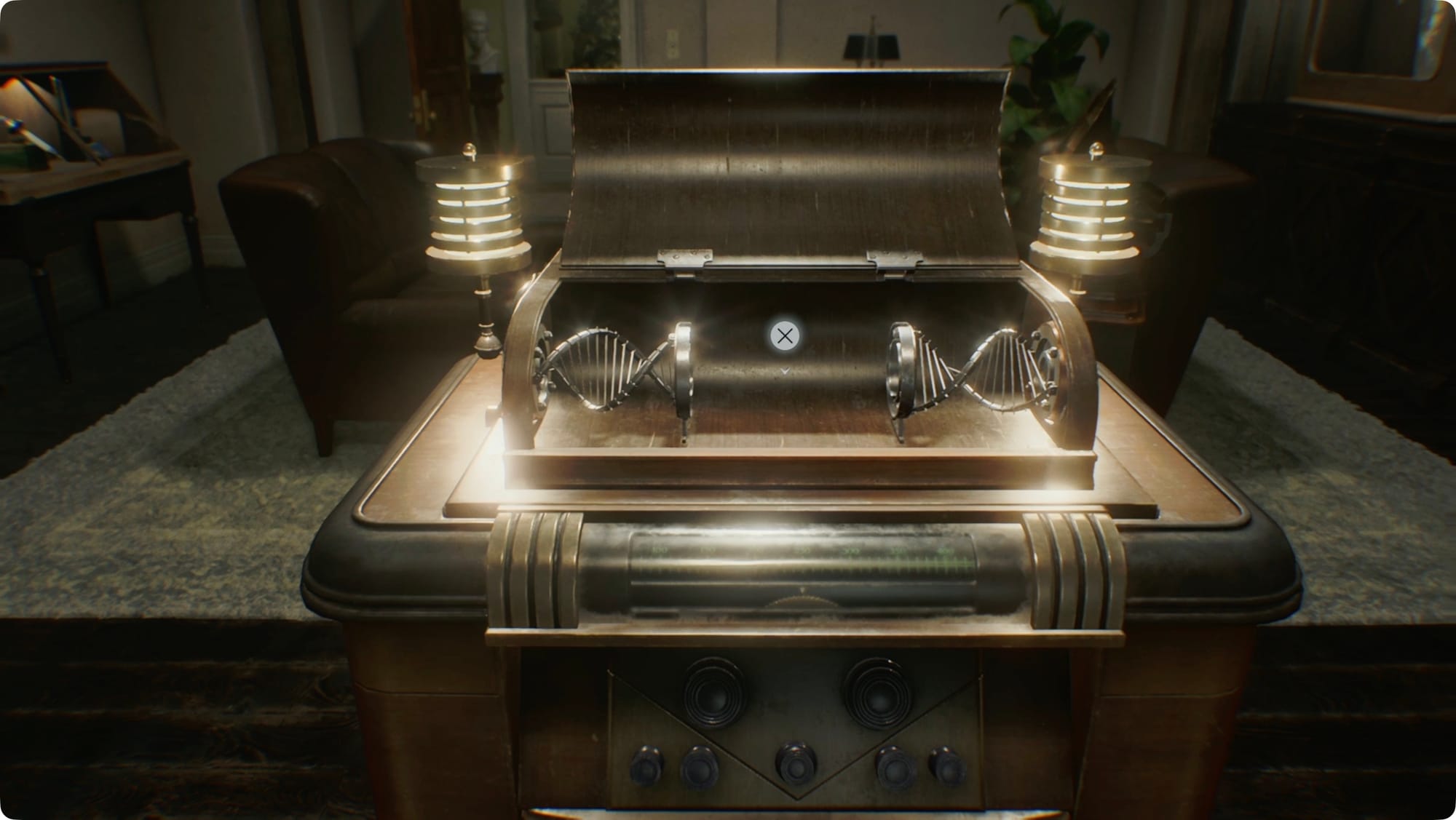 Interagiere mit dem altmodischen Radio in der Mitte des Raumes, um ein verstecktes Fach zu öffnen. Setzen Sie das Doppelhelix-Modell ein, um den gesamten Raum in einen Aufzug zu verwandeln.