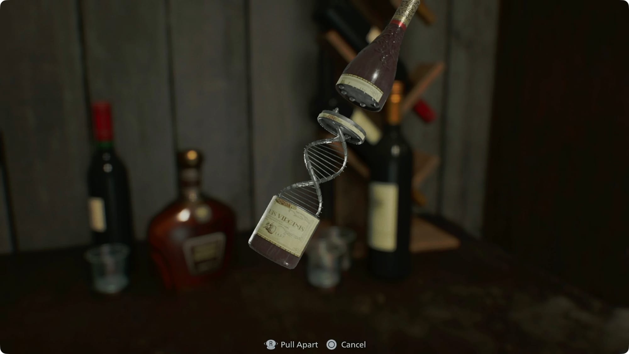 Nehmen Sie beim Betreten auf der linken Seite (rechts, wenn Sie sich hinter dem Schreibtisch befinden) die Weinflasche. Untersuchen Sie es genauer, um zu erkennen, dass es sich um ein Rätsel handelt. Drehen Sie die Oberseite und öffnen Sie sie für das Doppelhelix-Modell.