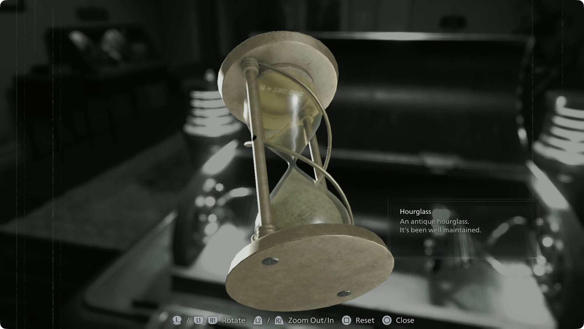 Sie erhalten eine sehr saubere Rezeption. Ganz rechts in der Ecke befinden sich eine Schreibmaschine und eine Item-Box. Öffnen Sie, während Sie hier sind, Ihr Inventar und untersuchen Sie die Sanduhr. Drehen Sie es um, um etwas Sand abzulassen, und Sie werden ein Geheimnis entdecken, das hinter dem Glas aufgedruckt ist – U = 380.000. Sobald Sie es sehen, können Sie es in die Artikelbox legen.