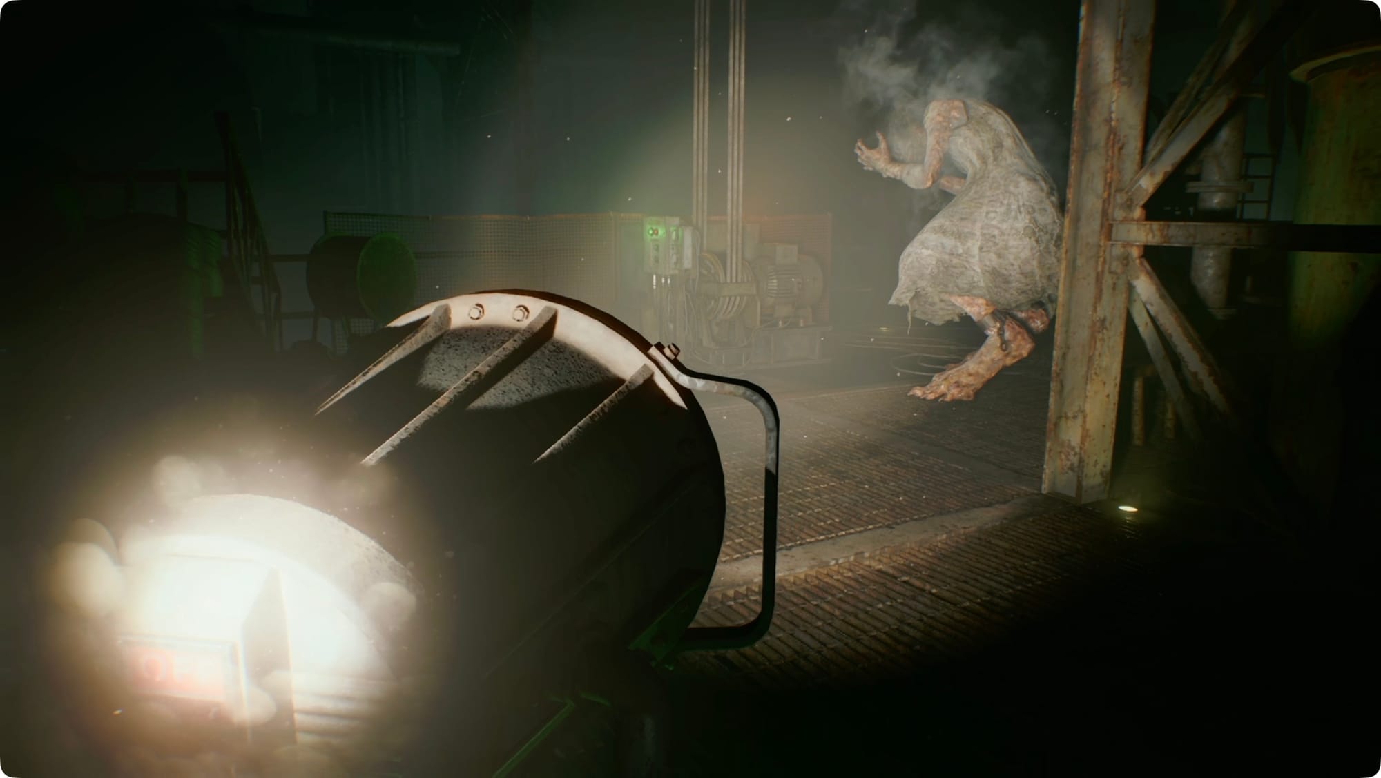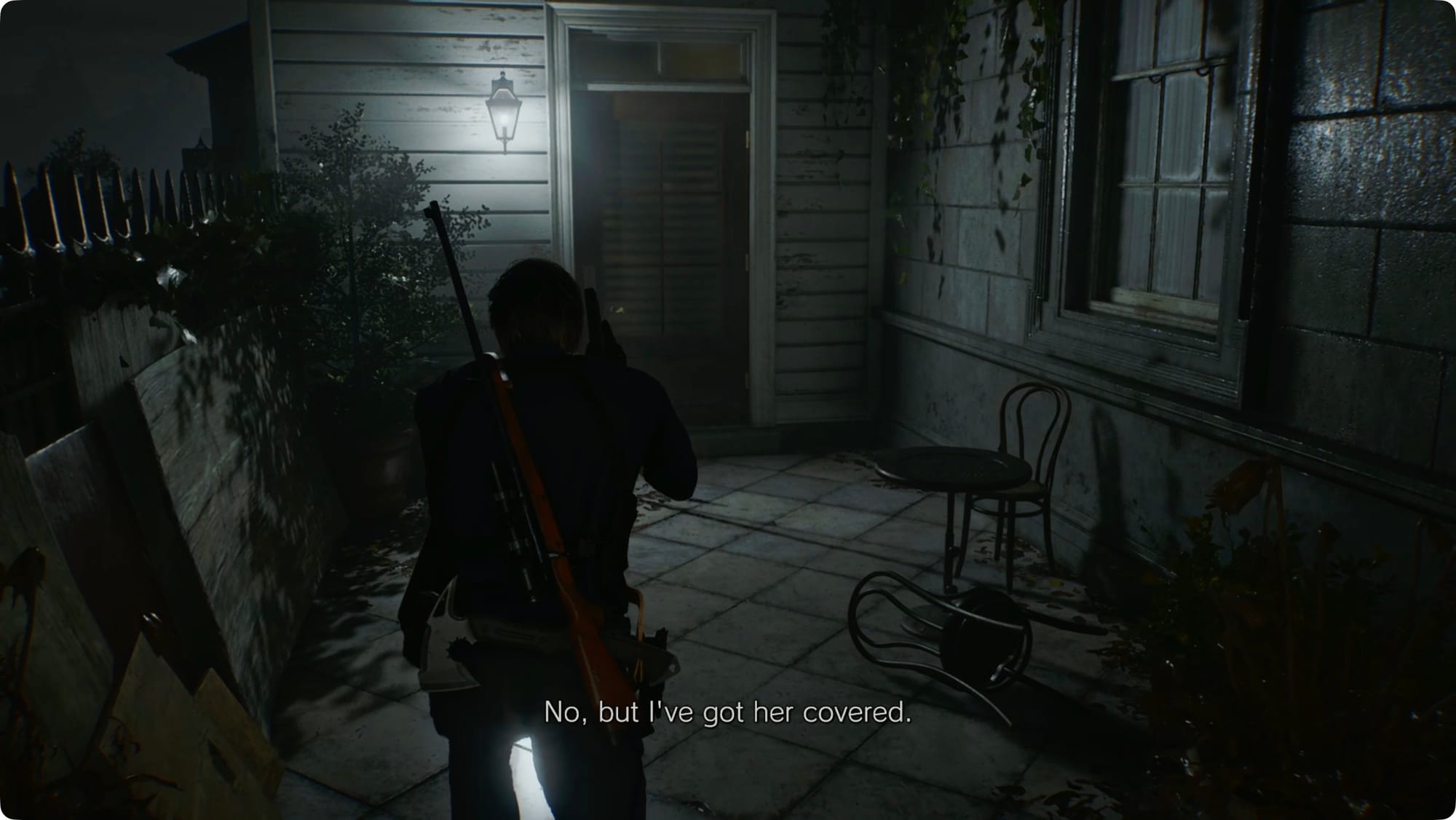 Nachdem Leon eine unangenehme Zeit lang die Treppe hinuntergeblickt hat, übernehmen Sie die Rolle von Grace. Es gibt nichts aufzuheben und nur einen Weg, also gehen Sie einfach weiter, bis Sie am oberen Ende einiger Treppen auf auffällige Scheinwerfer stoßen.