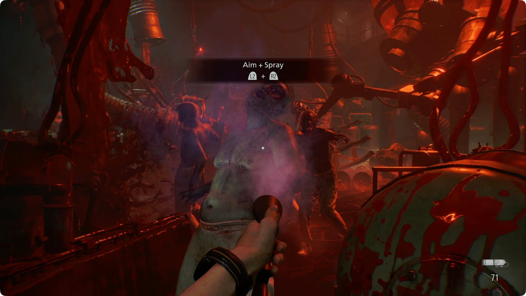 An der Wand rechts befindet sich ein Entsorgungstank. Behandeln Sie dies wie einen Zombie-Löscher. Eine kleine Menge reicht jedoch weit, also verschwenden Sie nicht die Ladung. Sobald ein Zombie auf die Knie fällt oder anfängt zu zucken, ist er erledigt. Arbeiten Sie sich nach Norden vor (links von der Stelle, an der Sie eingetreten sind). Der nächste Tank befindet sich an der linken Wand. Wiederholen Sie den Vorgang, um den nächsten Tank an der linken Wand zu erreichen.