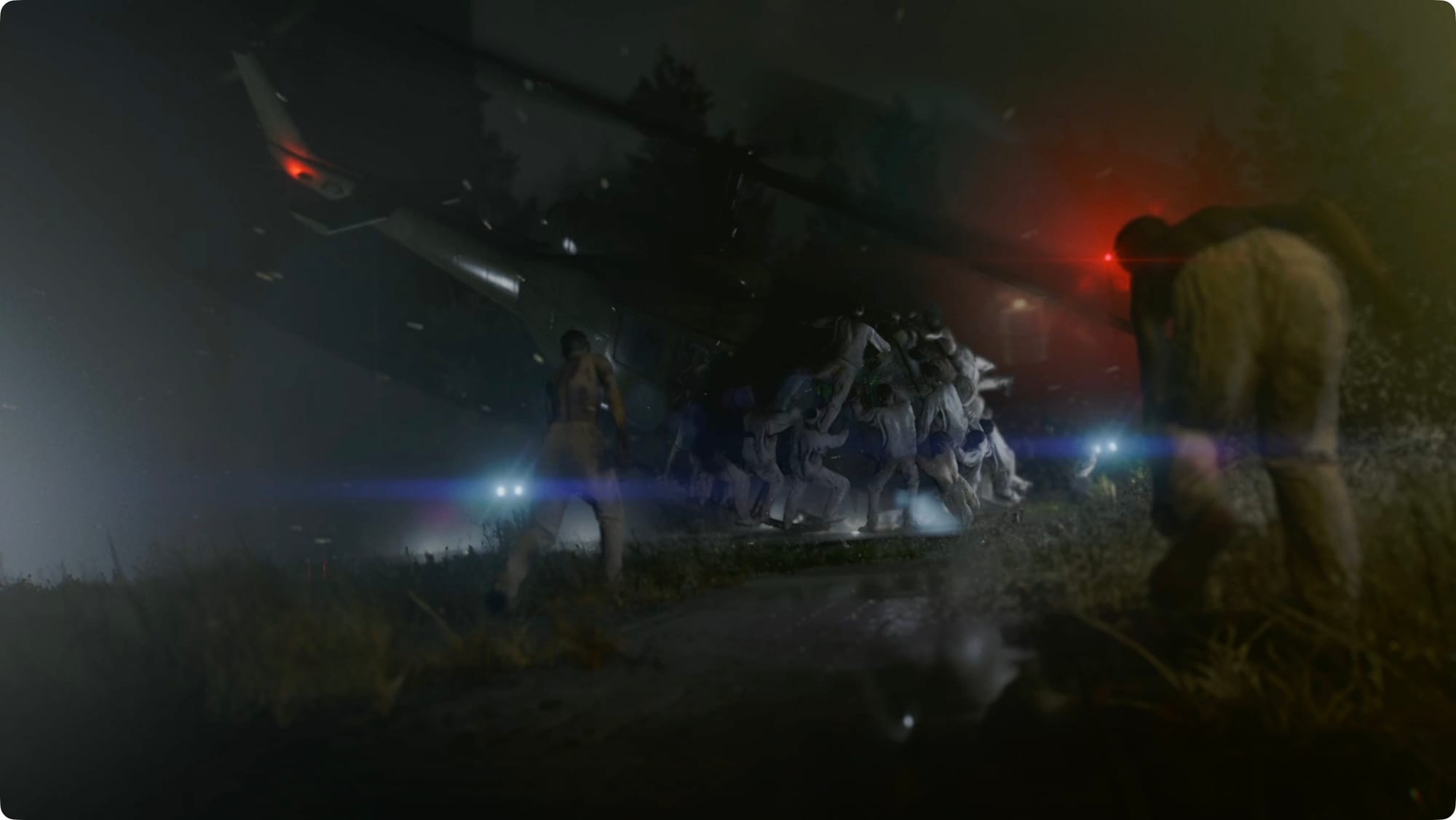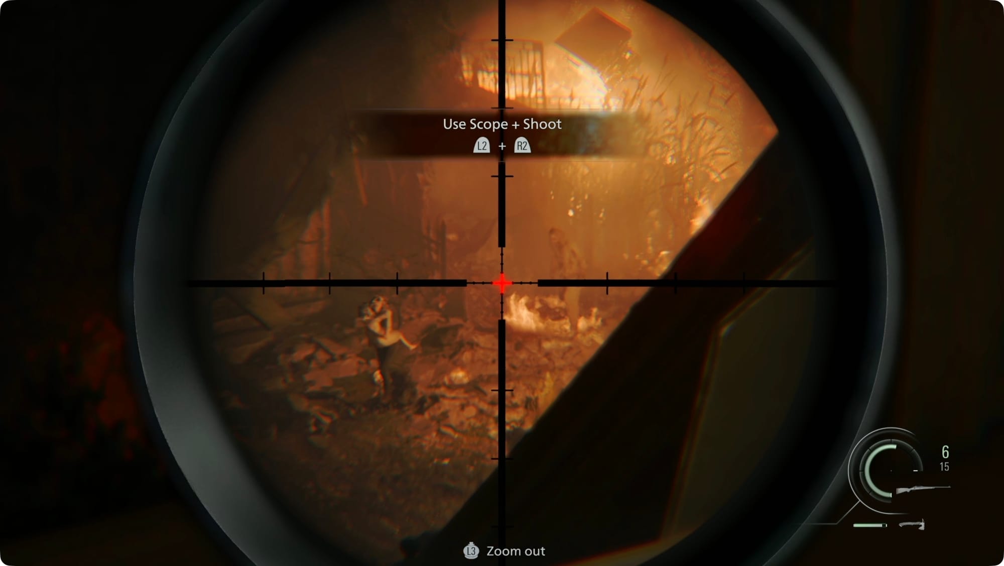 Folgen Sie dem Pfad und erledigen Sie die drei Zombies, die versuchen, Sie anzuspringen – Graces Waffe macht die Sache viel einfacher. Kriechen Sie durch das Fenster ins Haus und hinaus zum Hubschrauberlandeplatz.