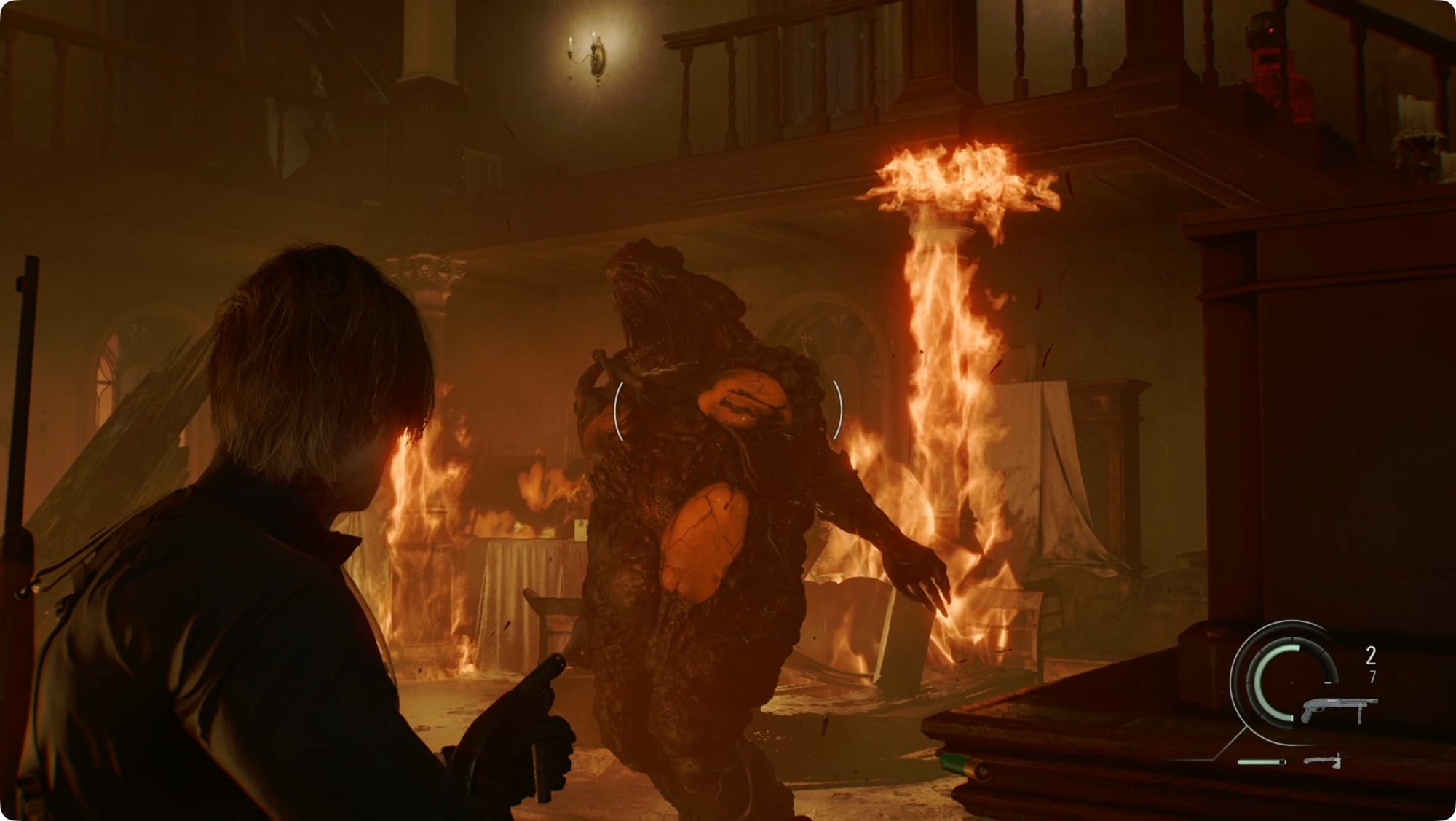 Nach der Zwischensequenz taucht Leon auf, um grüblerisch den Tag zu retten. Schießen Sie einfach weiter.