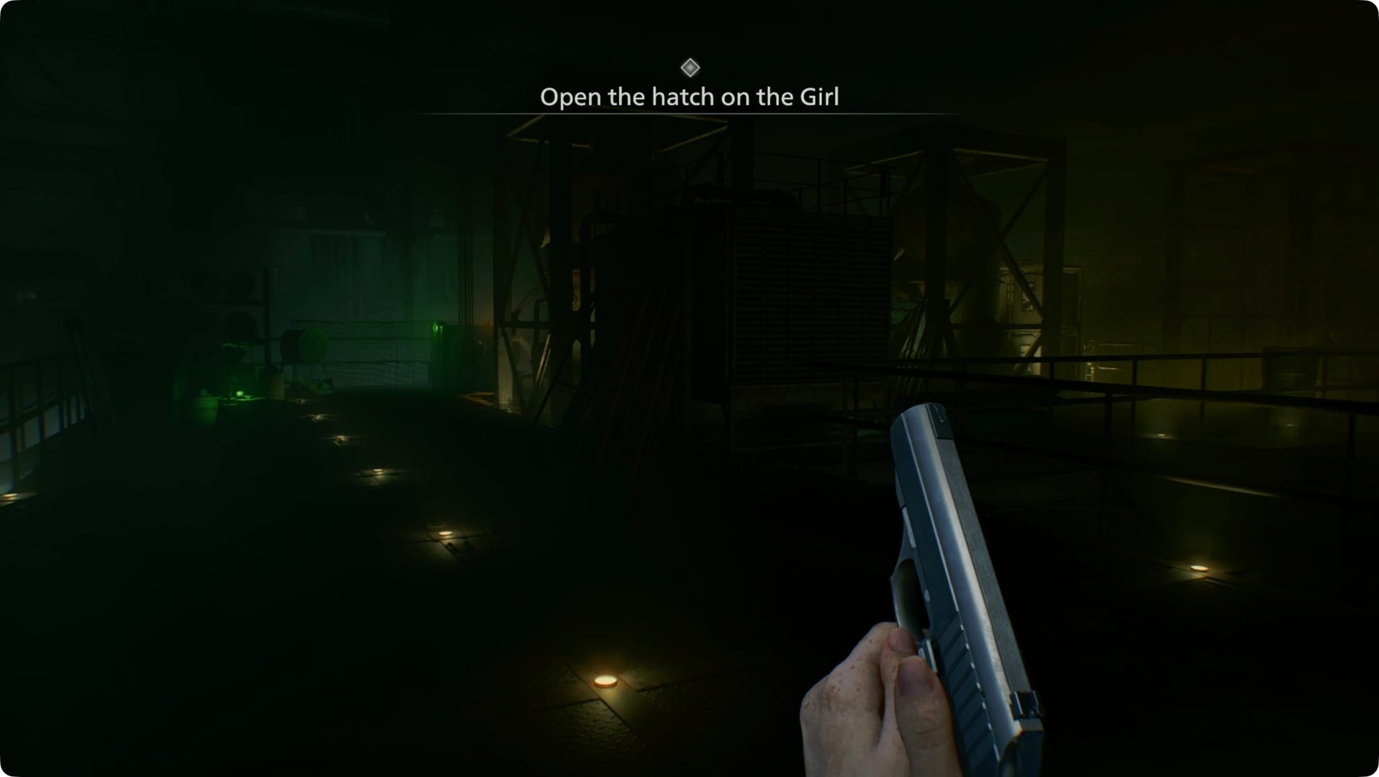 Lauf zurück zum Aufzug und nimm ihn hoch. Oben wird das Mädchen wieder auftauchen. Überspringen Sie den Lukenknopf und schalten Sie zuerst den Scheinwerfer ein. Wenn das Mädchen betäubt ist, haben Sie genug Zeit, den Knopf zu drücken.