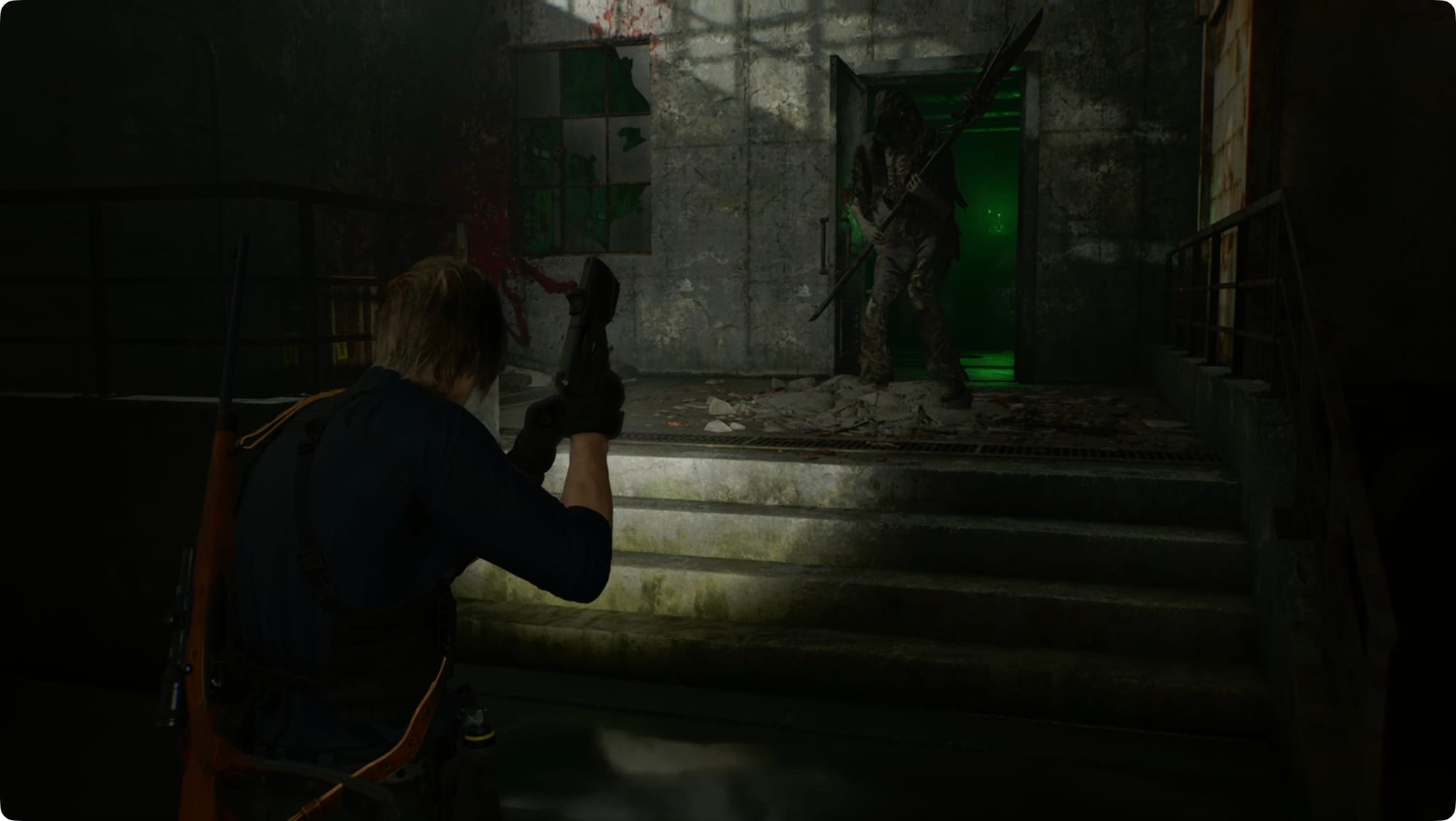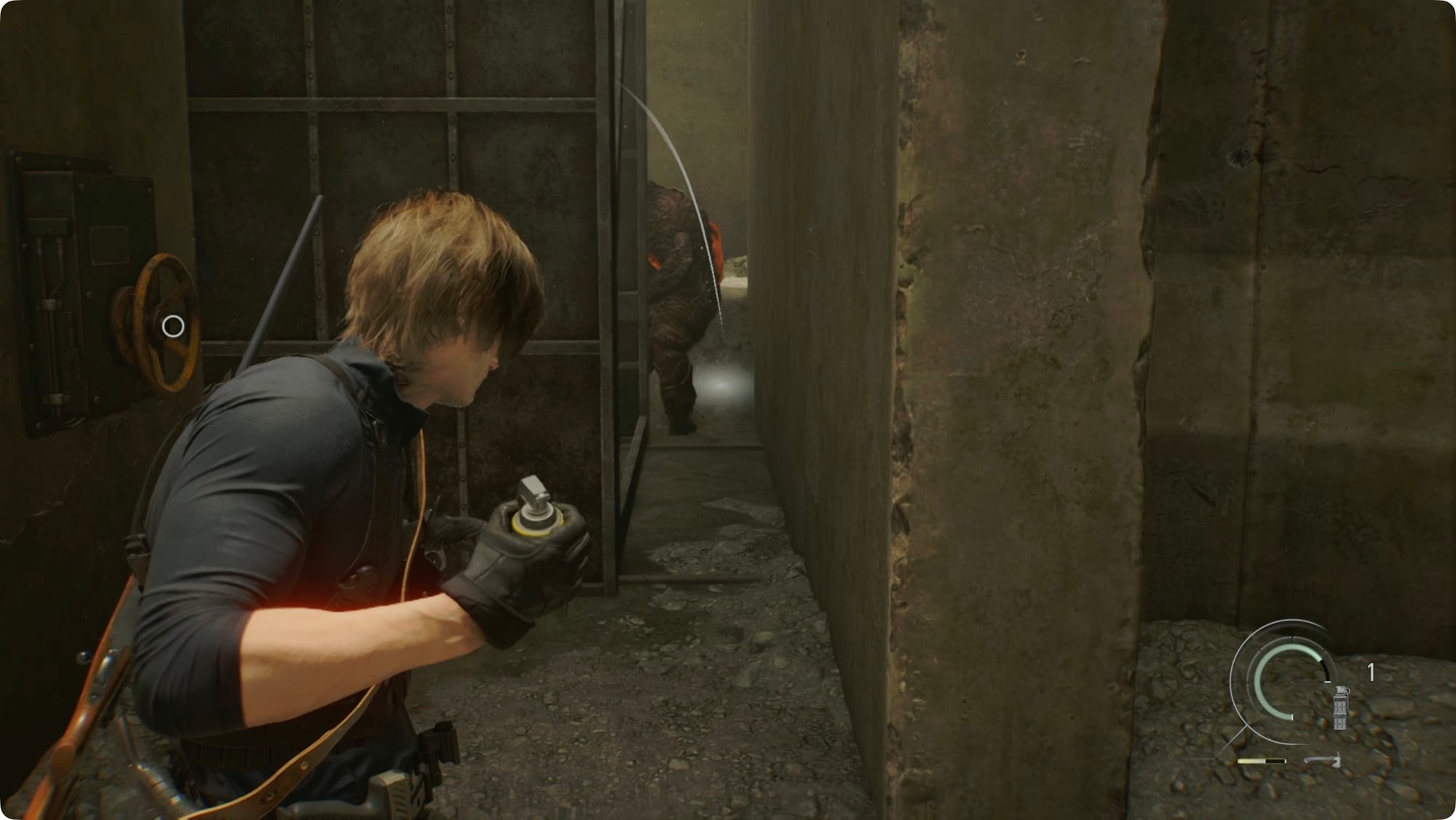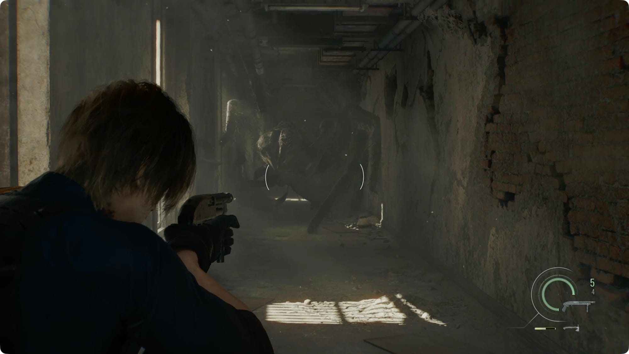 Drehen Sie sich um (zurück auf den linken Daumenstick + B/Kreis) und rennen Sie den ganzen Weg zurück zur eingestürzten Tür. Sie können ein paar Schüsse landen, aber der nächste Teil ist im Drehbuch festgelegt – Leon wird durch die Wand geschleudert.