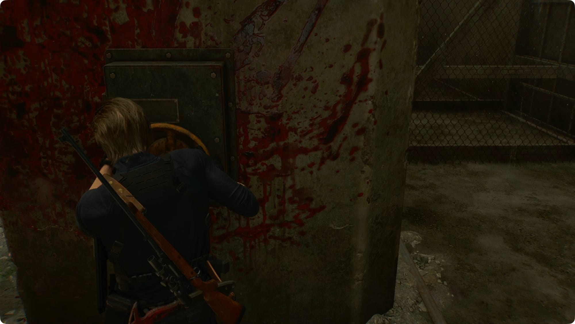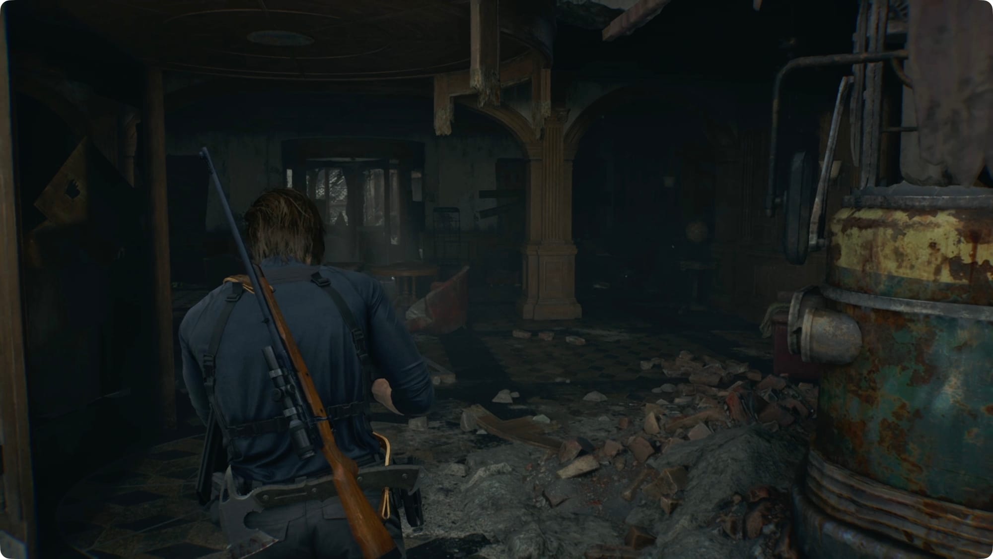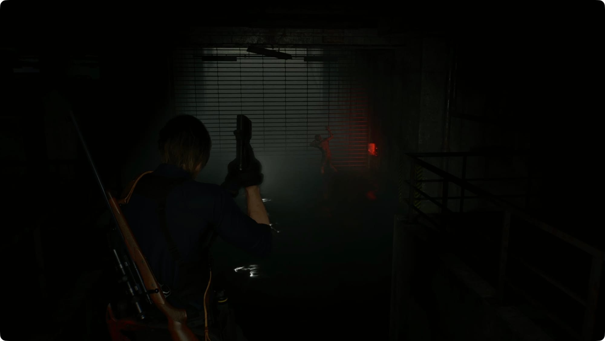 Drehen Sie sich um (zurück auf den linken Daumenstick + B/Kreis) und rennen Sie den ganzen Weg zurück zur eingestürzten Tür. Sie können ein paar Schüsse landen, aber der nächste Teil ist im Drehbuch festgelegt – Leon wird durch die Wand geschleudert.
