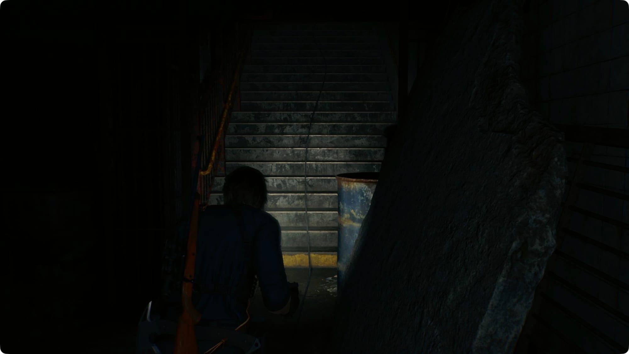 Wenn Sie durch das Tor kommen, schießen Sie die Kiste vor Ihnen ab, um eine Handgranate zu erhalten. An der nächsten Ecke führt die Treppe nach oben zu einer verschlossenen Tür, und die Leiter ist außer Reichweite, also nach unten.