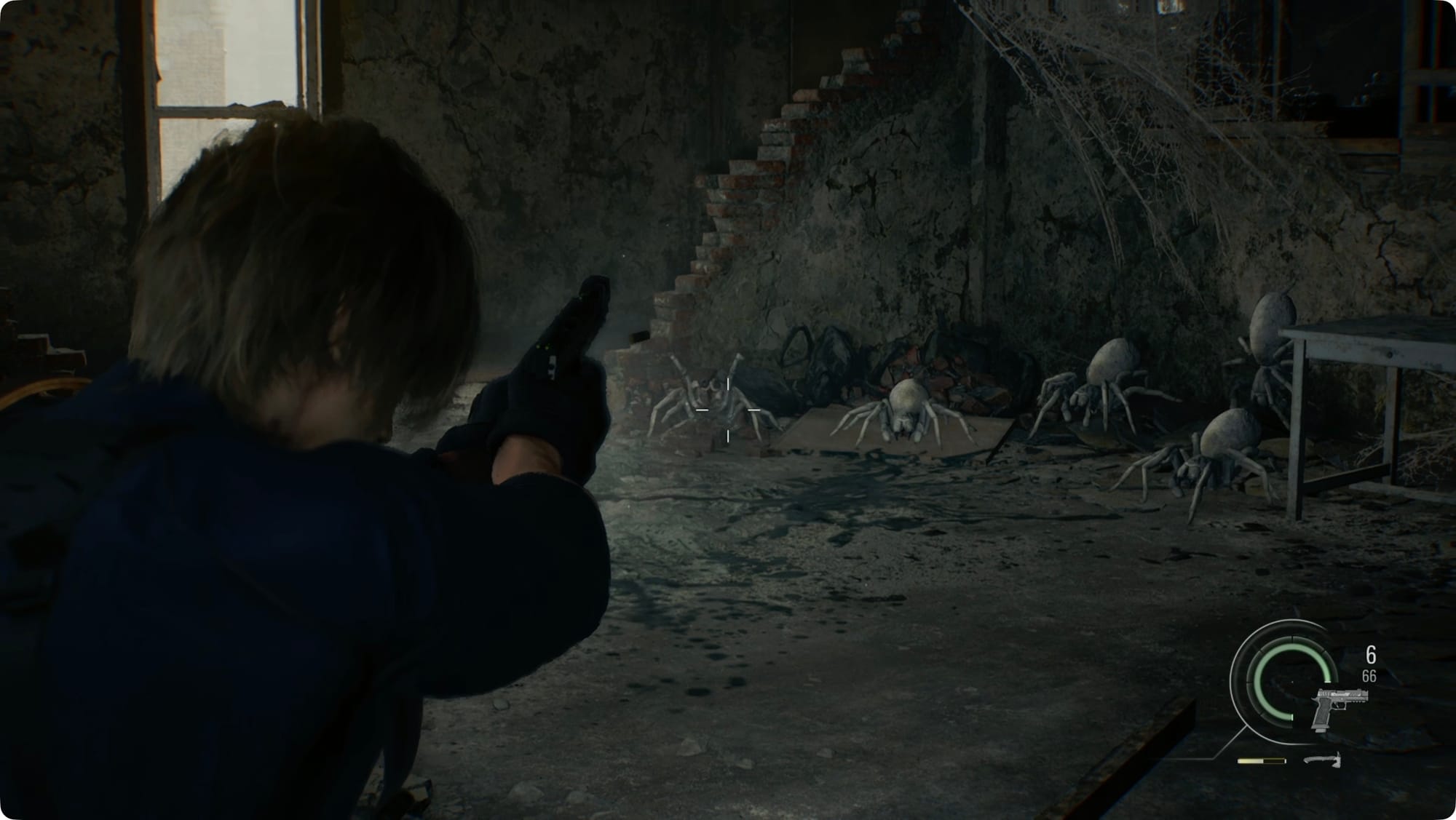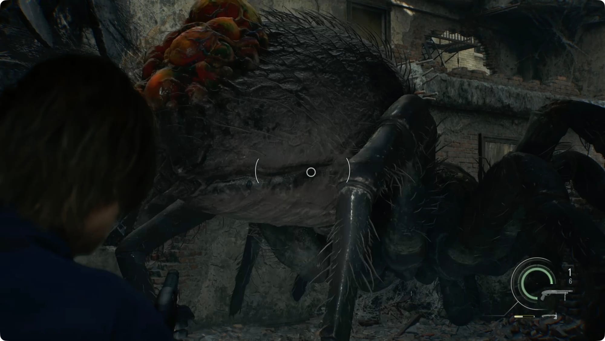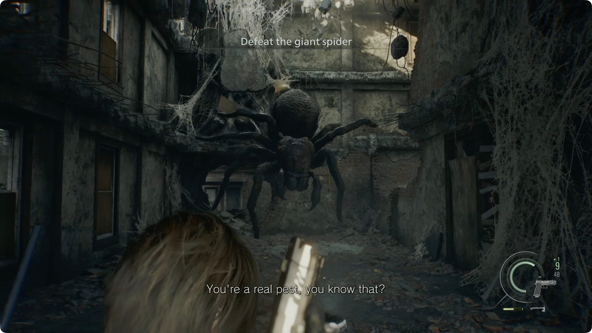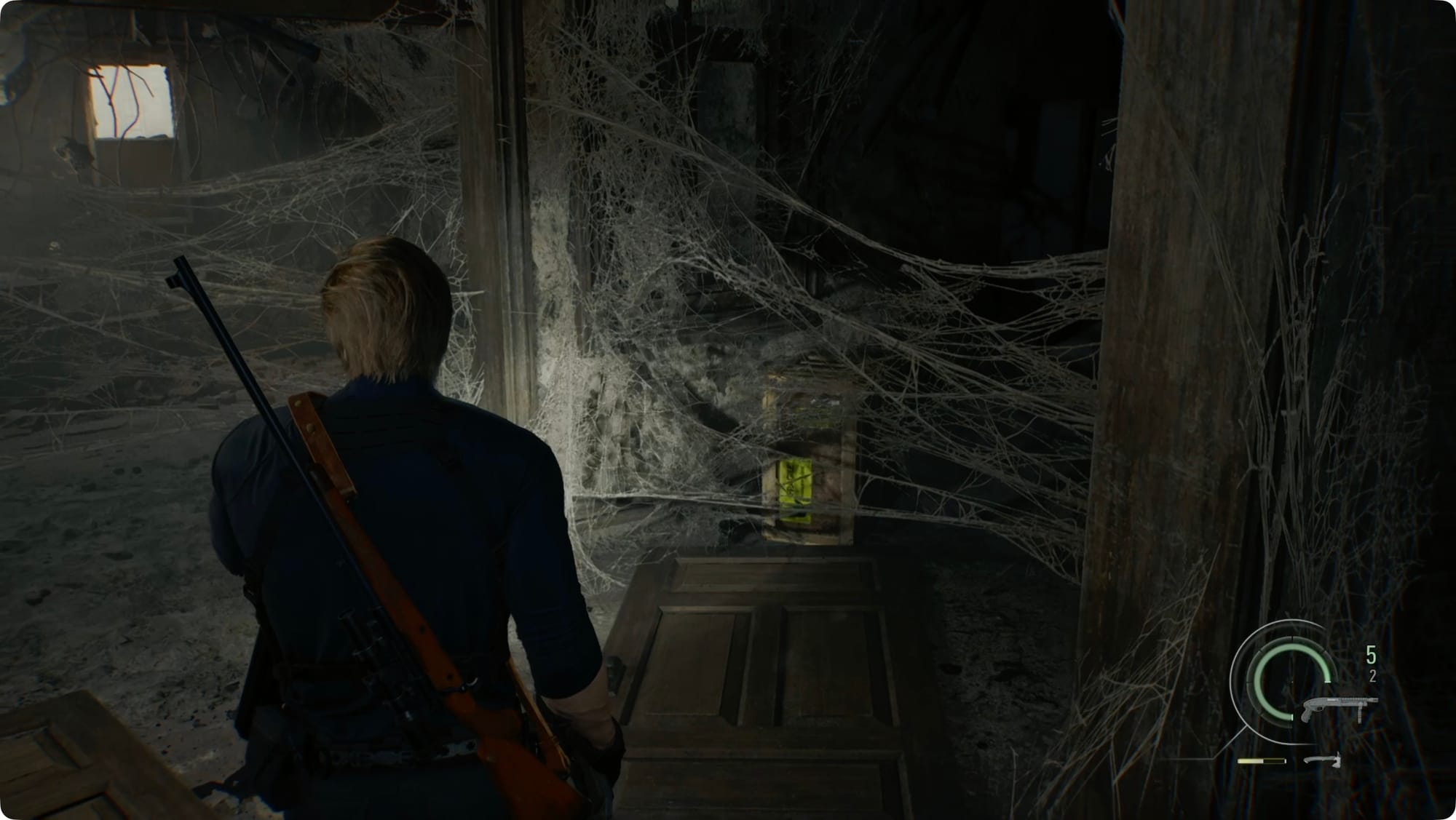 Wenden Sie sich zur eingestürzten Tür ab und zerschlagen Sie die Kiste, um weitere Schrotpatronen zu erhalten. Folgen Sie der Halle, bis die Spinne wieder auftaucht.
