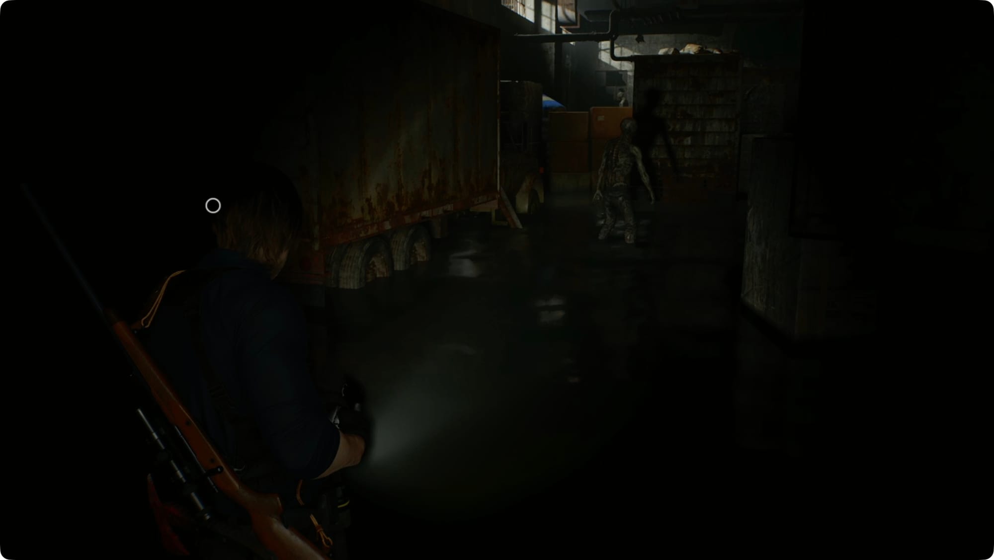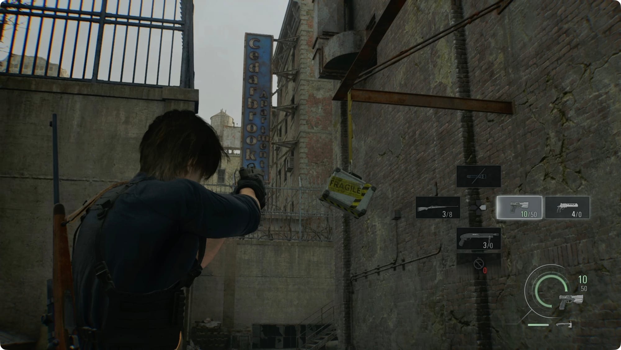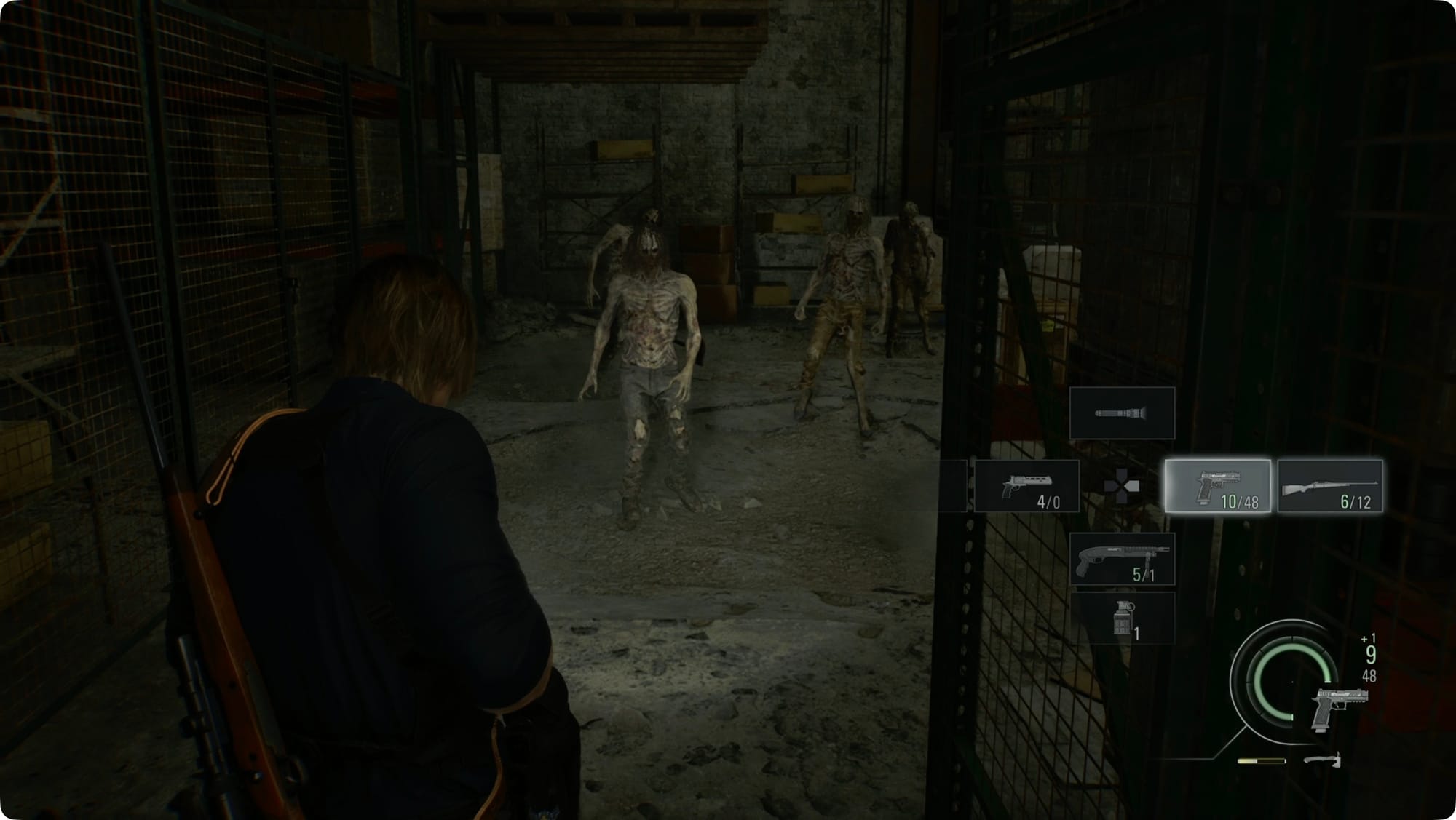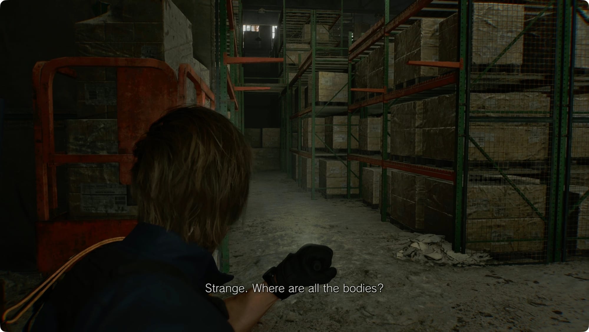 Drüben im Osten, im eigentlichen Lagerhaus, wird Leon das sagen, was Sie sagen würden, wenn Sie versuchen würden, von Zombies angegriffen zu werden. Biegen Sie links ab. Zerschlagen Sie die Kiste, um ein paar Schrotpatronen zu holen, und biegen Sie dann rechts ab.
