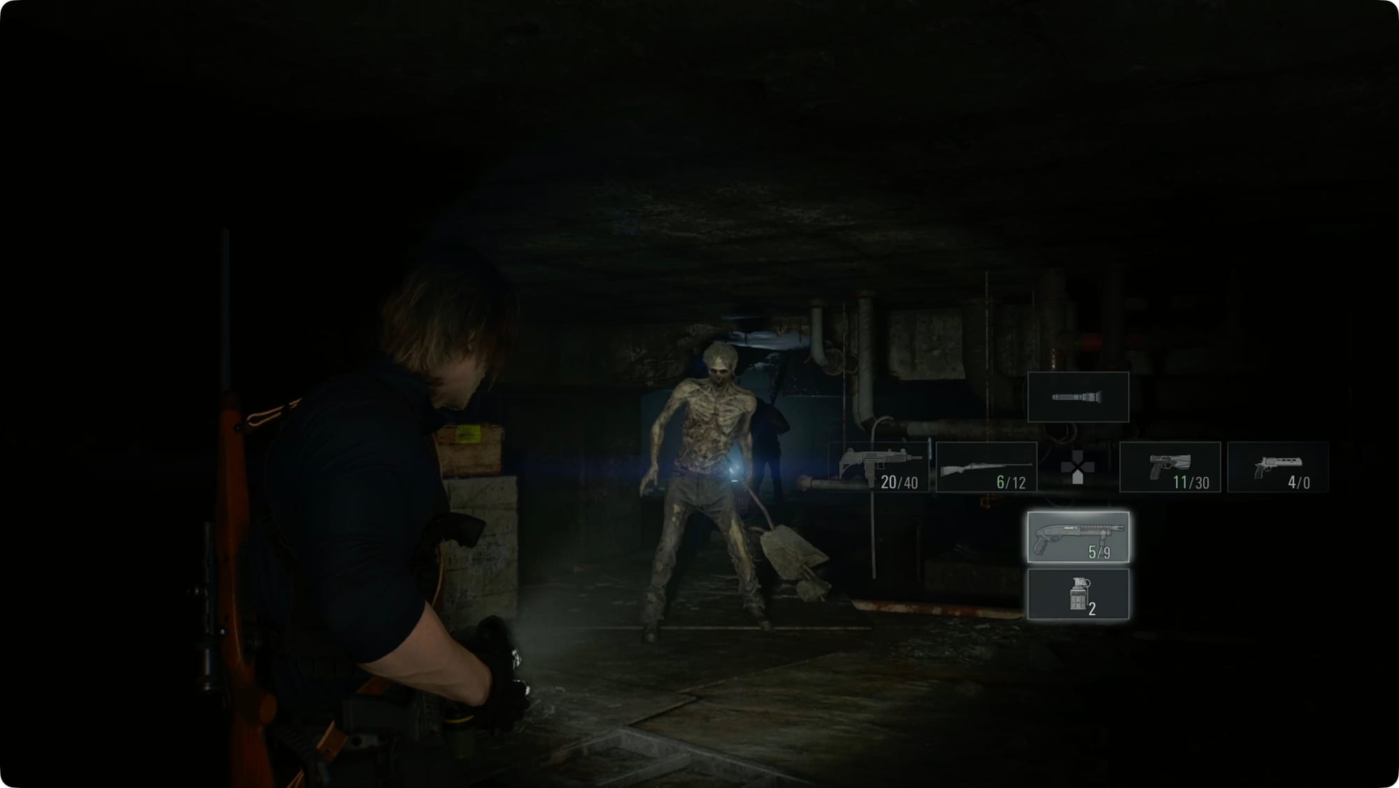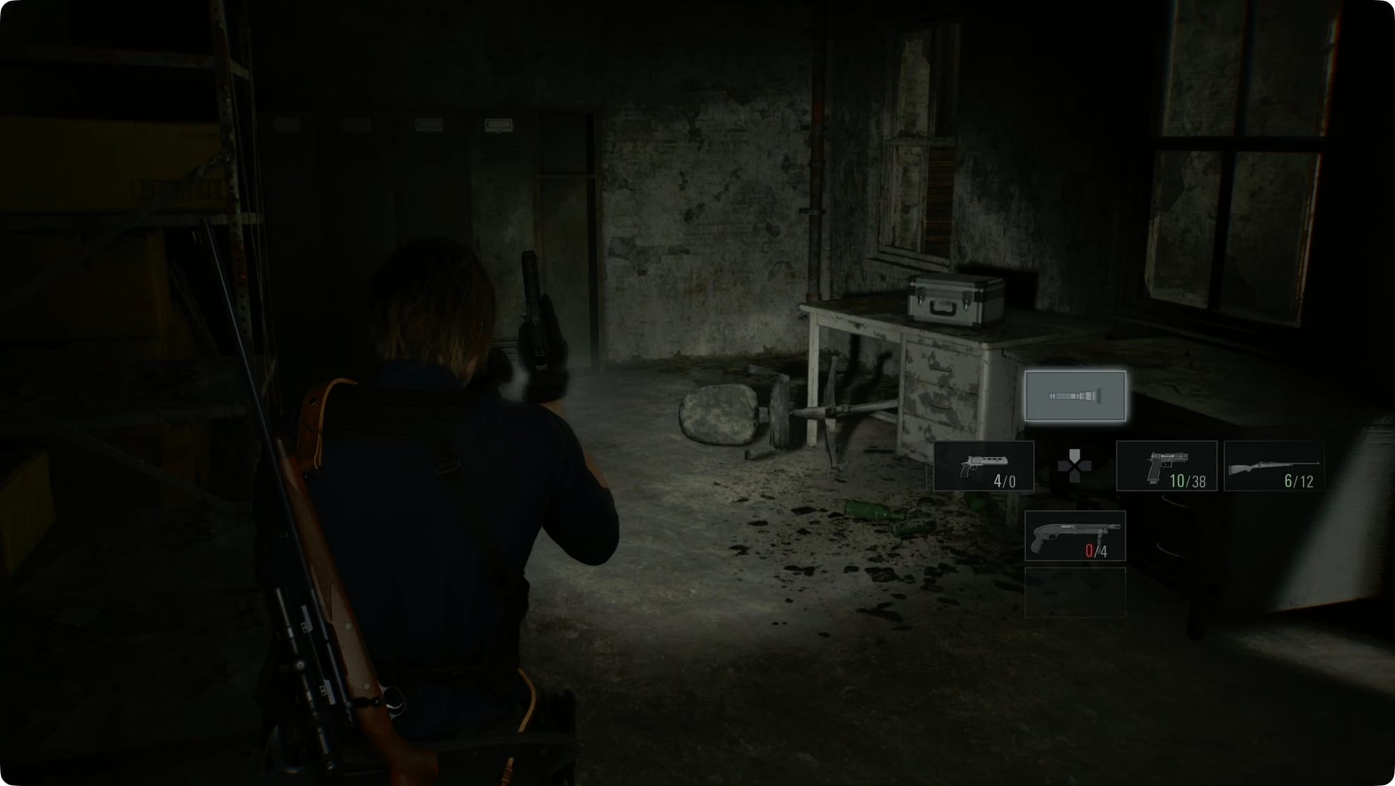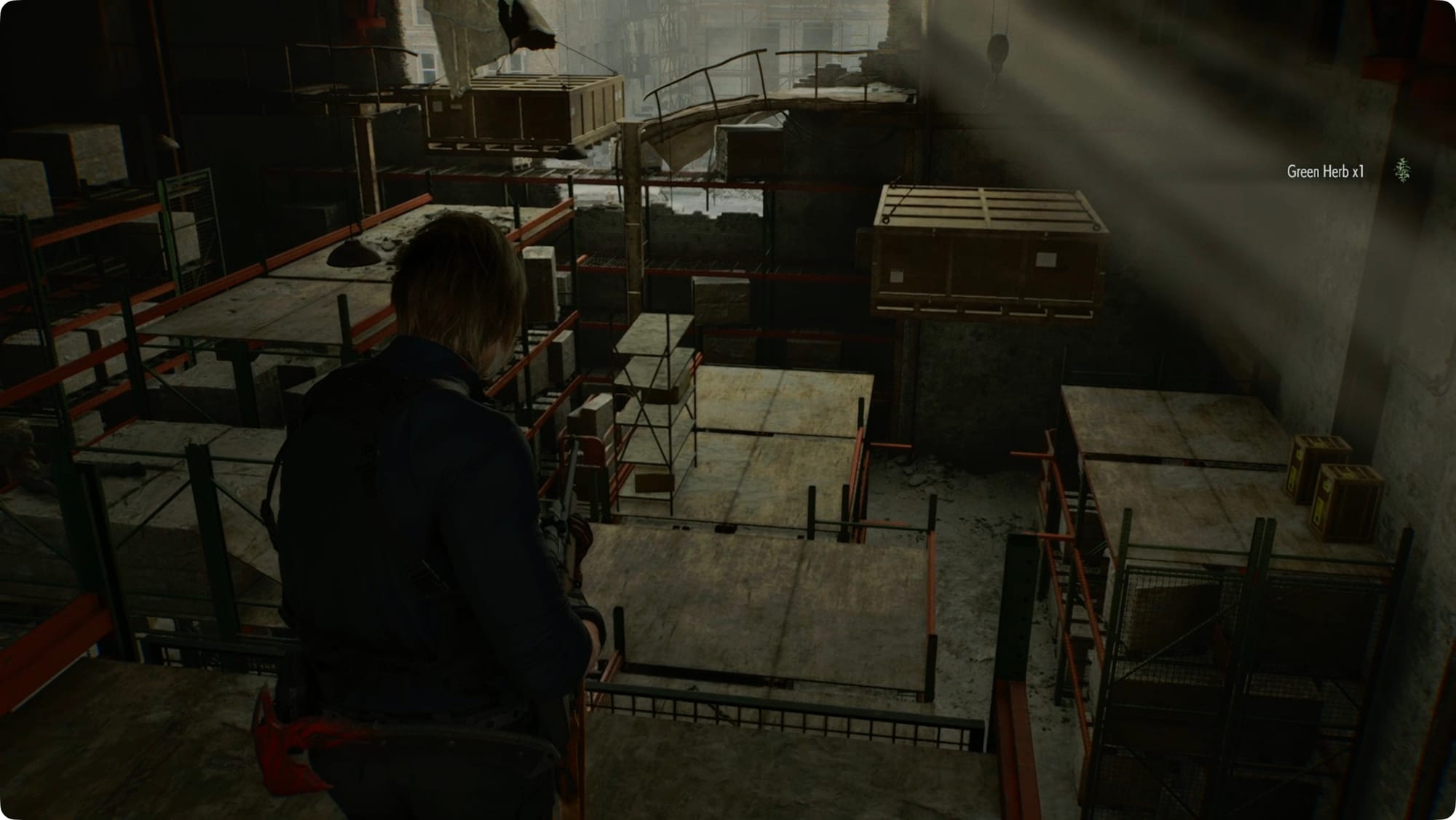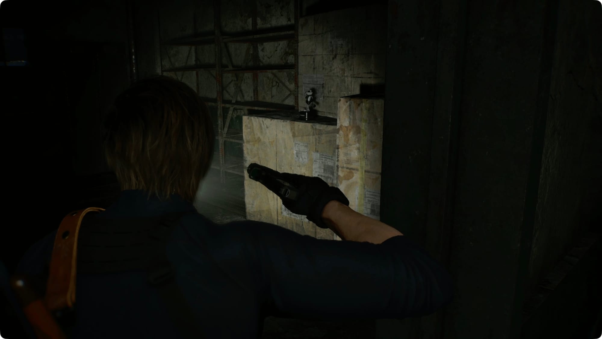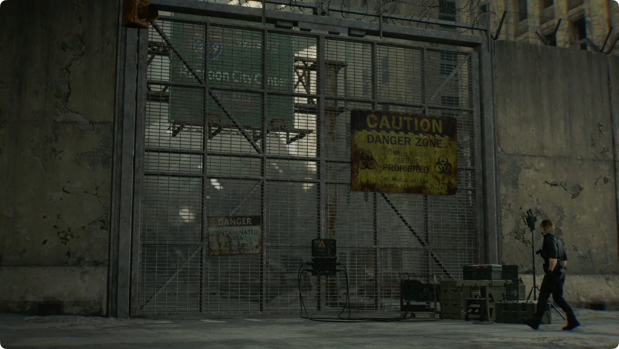 Drüben im Osten, im eigentlichen Lagerhaus, wird Leon das sagen, was Sie sagen würden, wenn Sie versuchen würden, von Zombies angegriffen zu werden. Biegen Sie links ab. Zerschlagen Sie die Kiste, um ein paar Schrotpatronen zu holen, und biegen Sie dann rechts ab.