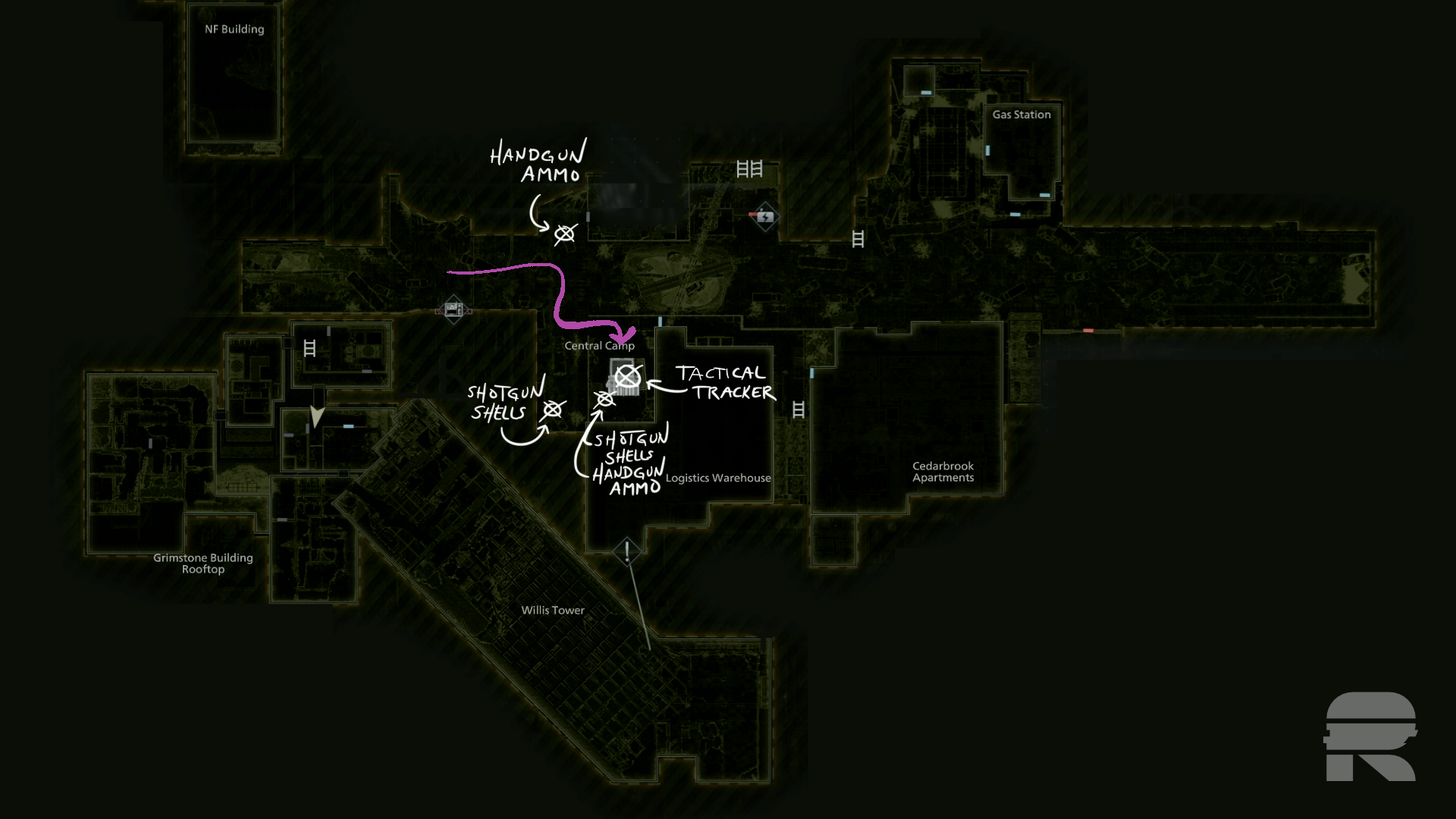 Gehen Sie ein Gebäude weiter zum Applegate Hotel. Schneiden Sie nach rechts, um mehr Scrap und die Notiz „From Meryl to Mommy“ zu erhalten. Suchen Sie auf der linken Seite hinter der Rezeption nach einem Med Injector. An der Rückwand befinden sich einige Schrotpatronen. Durch die Drehtür hinten schieben.