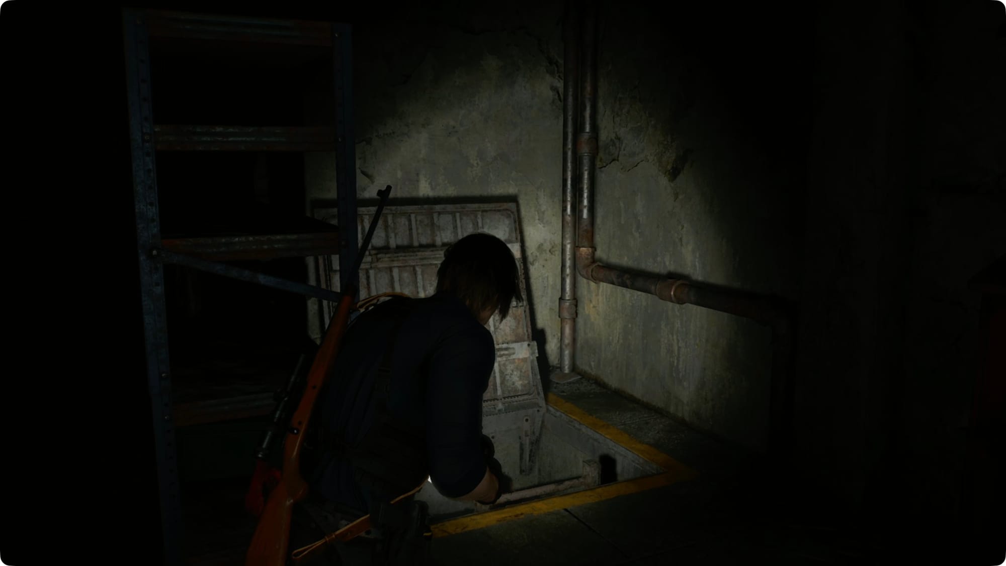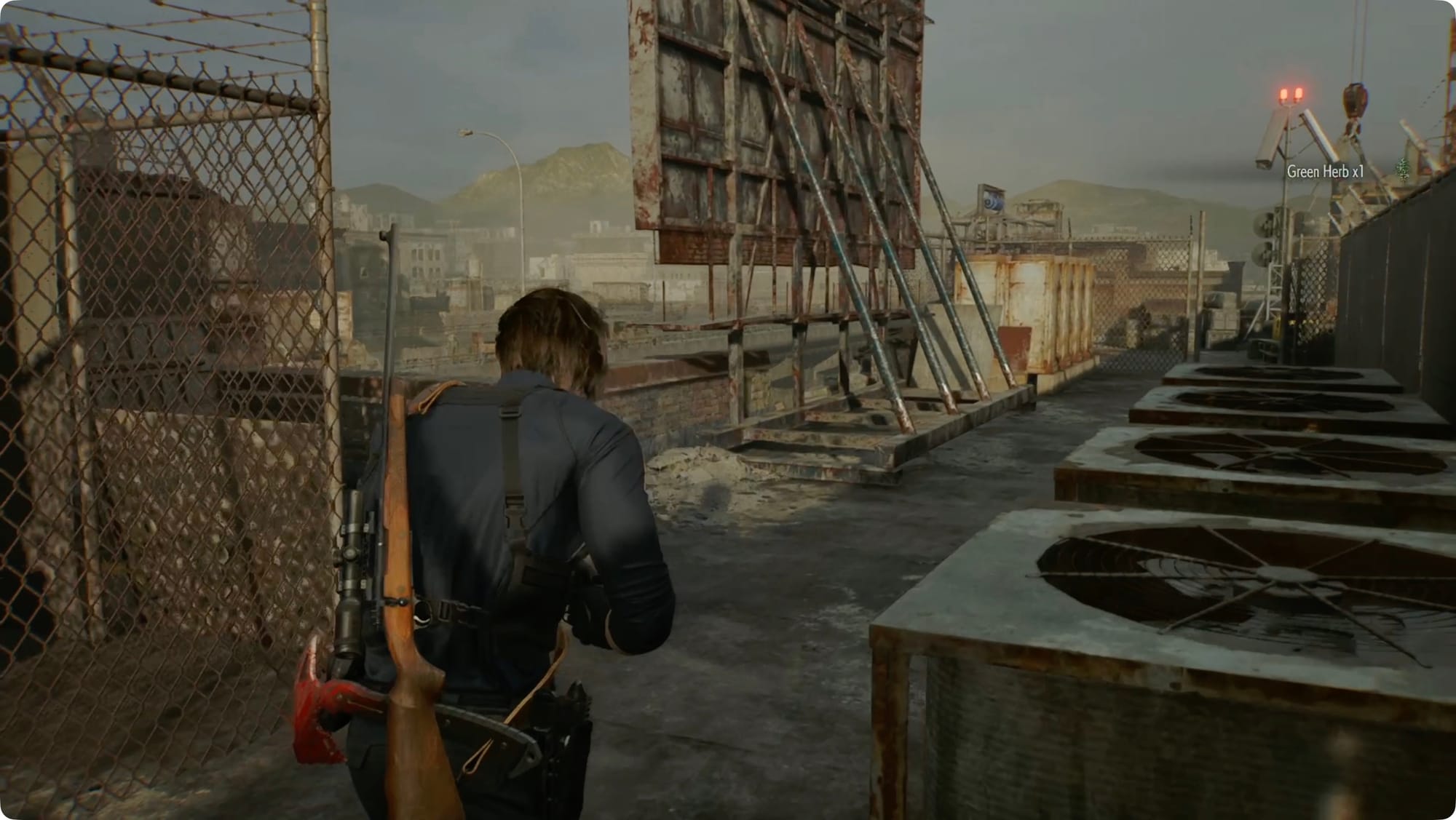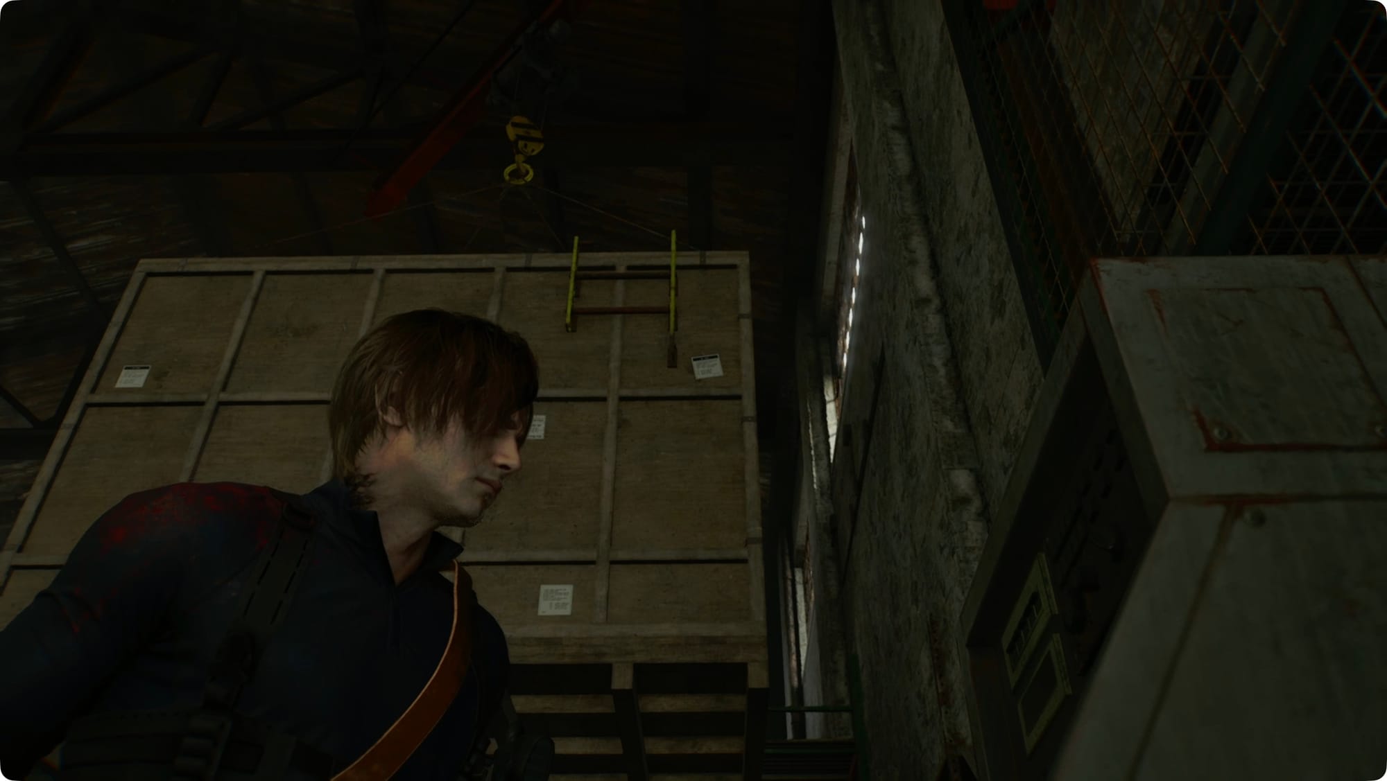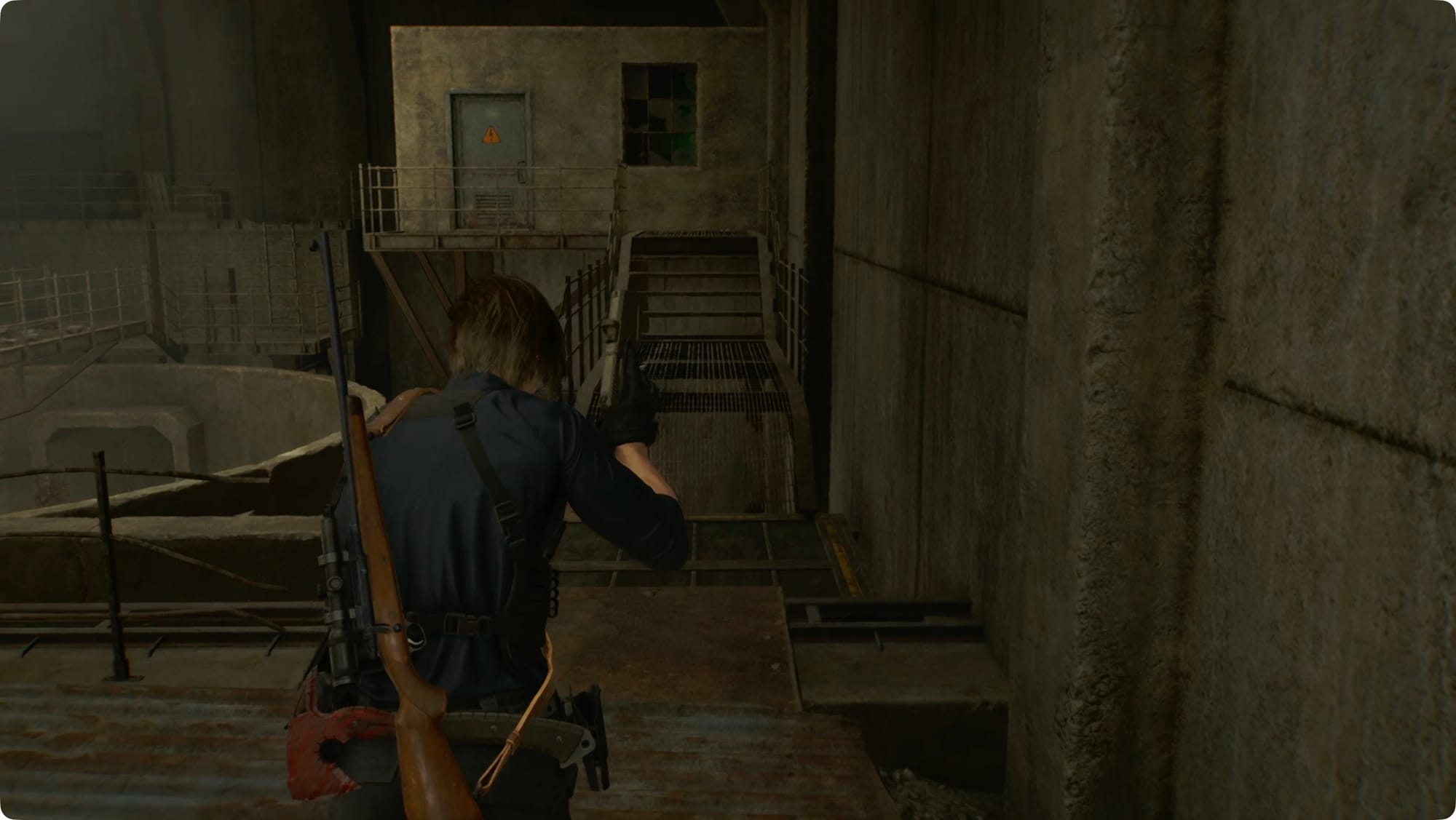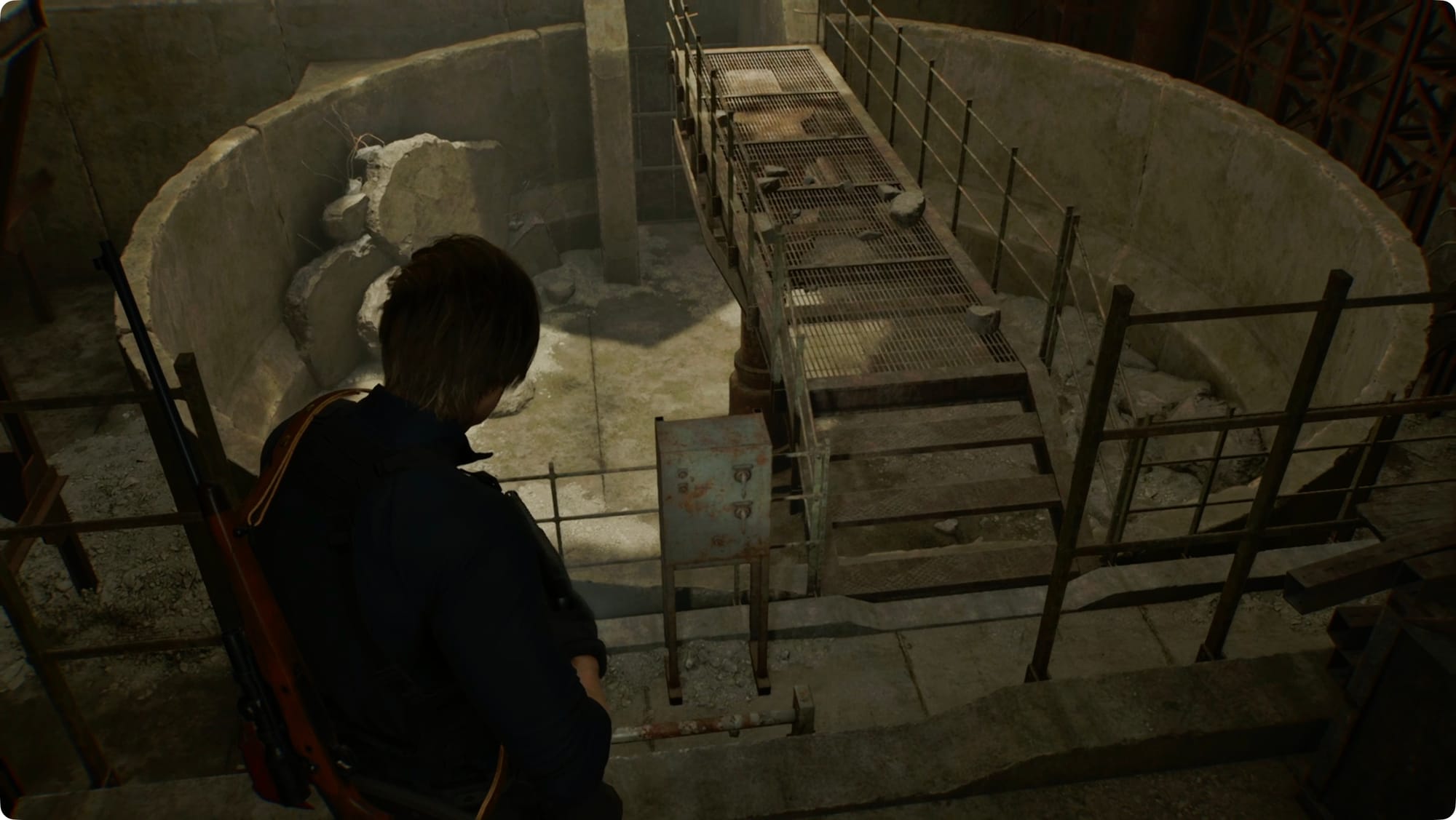Leon wird einen Entfernungsmesser hervorholen. Folgen Sie den Bögen, um Ihre drei Ziele zu finden – geradeaus, unten und links sowie hinter und über Ihnen. Biegen Sie links ab und fahren Sie mit dem Aufzug zurück zum Central Camp.