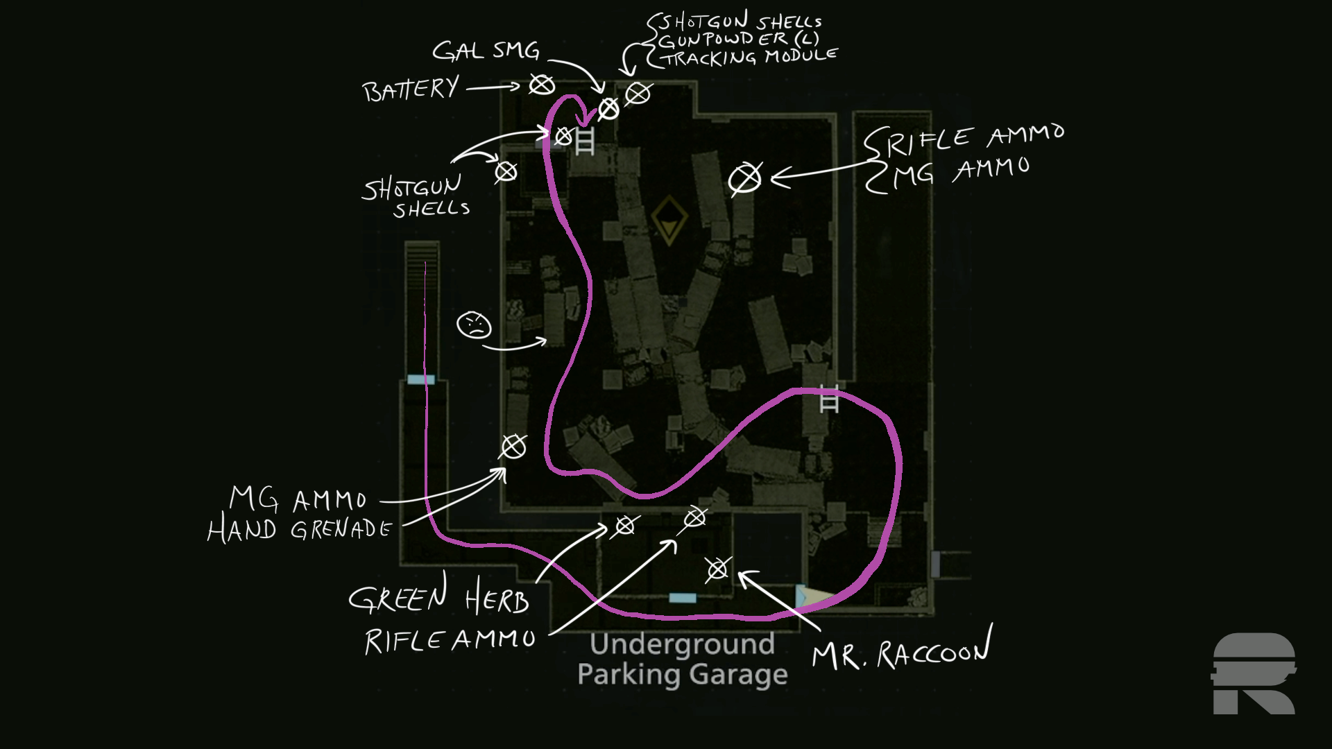 Biegen Sie links in die Tür ein, vor der er war. Darin befinden sich ein Mr. Raccoon, etwas Gewehrmunition, ein grünes Kraut und etwas Schrott.