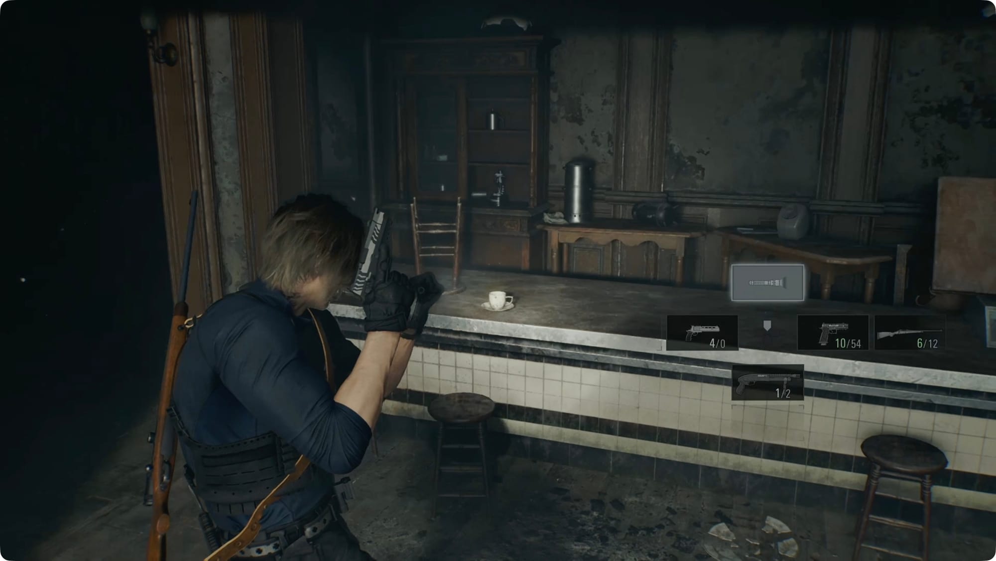Sollte bei Leon „ICH HABE ES DIR GESAGT“ sagen und die kleine Menge Zombies niedermachen. Achten Sie auf Tropfen von ihnen – zwei Schrott und ein Schießpulver (klein). Zerschmettere die Kiste in der Nähe, um ein paar Schrotpatronen zu erhalten. Gehen Sie den Mittelgang hinauf, um einen weiteren Zombie auszulösen, und schlängeln Sie sich dann an der gegenüberliegenden Wand zurück, um einen Knopf zum Drücken zu finden.
