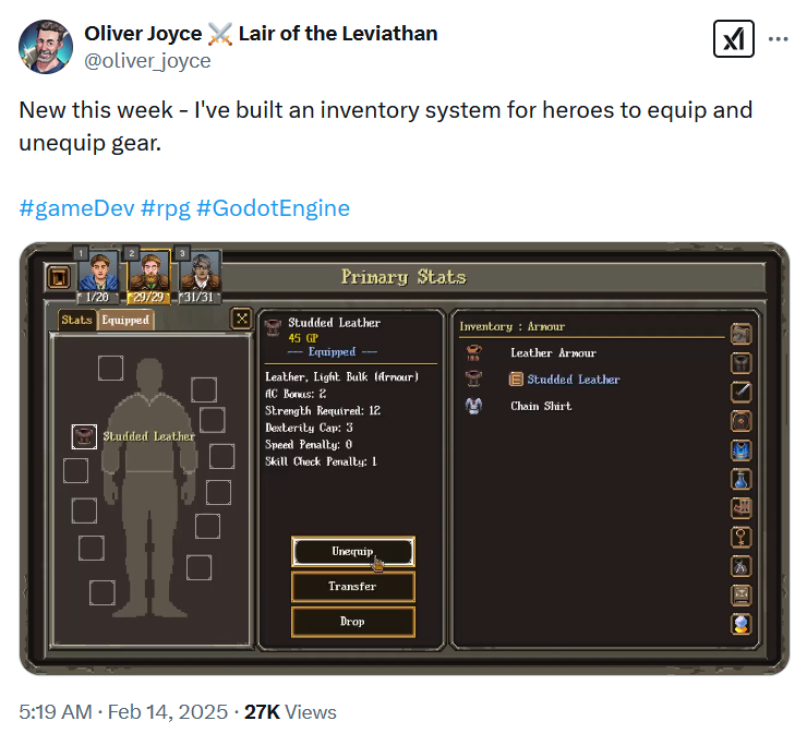 Oliver Joyce von WhiskeyBarrel Studios gab uns kürzlich einen Blick auf das Heldeninventarsystem in Lair of the Leviathan. Und wenn dieser Name vertraut klingt – ja, ist er es. Der einzige Schöpfer der Swords and Sandals Series! Also, wenn Ihre Nostalgie für das goldene Zeitalter der Flash -Spiele gerade eingetreten ist, vertrauen Sie mir, Sie sind nicht allein.