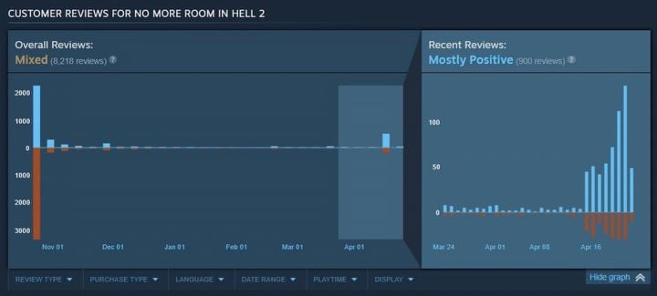 Im Gegensatz dazu traf kein Platz mehr in der Hölle 2 am 22. Oktober 2024 den frühen Zugang, und die Dinge lief nicht so reibungslos. Am Starttag begann es stark mit fast 15.000 Spielern, aber das dauerte nicht. Die Steam -Bewertungen wurden mit einer „meist negativen“ Bewertung heiß (und nicht gut) und nur etwa 45% der über 7.000 Bewertungen positiv. Folgendes sagten die Spieler: