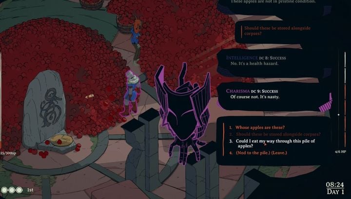 Und ja, Esoteric Ebb ist absichtlich seltsam. Das Spiel setzt auf Absurdität, schwarzen Humor, surreale Momente und bizarre Entscheidungen, wie zum Beispiel einen riesigen Haufen fauler Äpfel zu essen, nur um zu sehen, was sich darunter befindet. Wie der Entwickler es selbst beschrieb: „Werden Sie zum interessantesten Spieler am Tisch und ruinieren Sie Ihren DM-Tag komplett.“