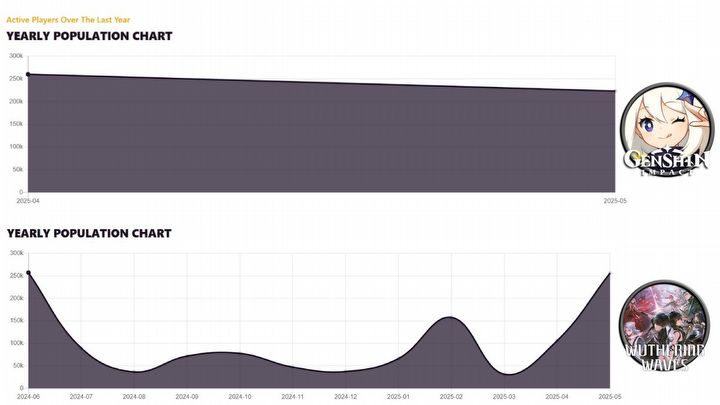 Wenn Sie sich die aktiven Spieler -Charts ansehen, hat Genshin im Grunde genommen eine flache Linie – stetig wie immer – eine loyale und stabile Spielerbasis. Wuwa hingegen war im Laufe des Monats eher eine Achterbahnfahrt mit Höhen und Tiefen. Aber die Dinge schauten gegen Ende April wieder auf, und das ist wahrscheinlich zu einer Kombination von Faktoren: Der Dampfstart brachte definitiv neue Leute ein, aber es waren wahrscheinlich die jüngsten Updates, neuen Resonatoren und die Jubiläumsveranstaltungen, die das Engagement und natürlich die Ausgaben wirklich vorantreiben.